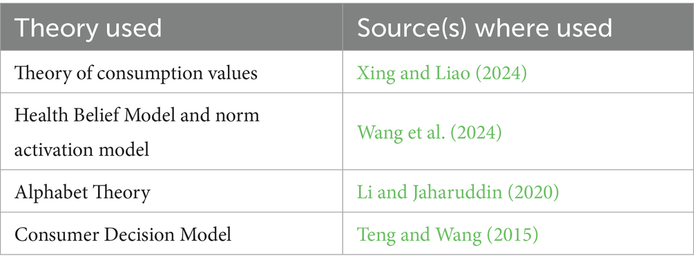 In 4 studies (see Table 4), TPB was used alongside other theories to expand the research scope and provide more in-depth analyses, meaning that TPB can be combined with other theories that introduce non-TPB constructs; these included values, skills, habits, past behavior, norms, motivation, and personal preferences. The use of these additional theories enabled researchers to overcome the limitations criticized in the original TPB model (see Figure 2). In total, 4 external theories (see Table 4) were identified, as follows: theory of consumption values (1 article); alphabet theory (1 article); Consumer Decision Model (1 article). In one of the studies, researchers decided to conjoin the TPB with two additional external theories: the Health Belief Model and the norm activation model (Wang et al., 2024).