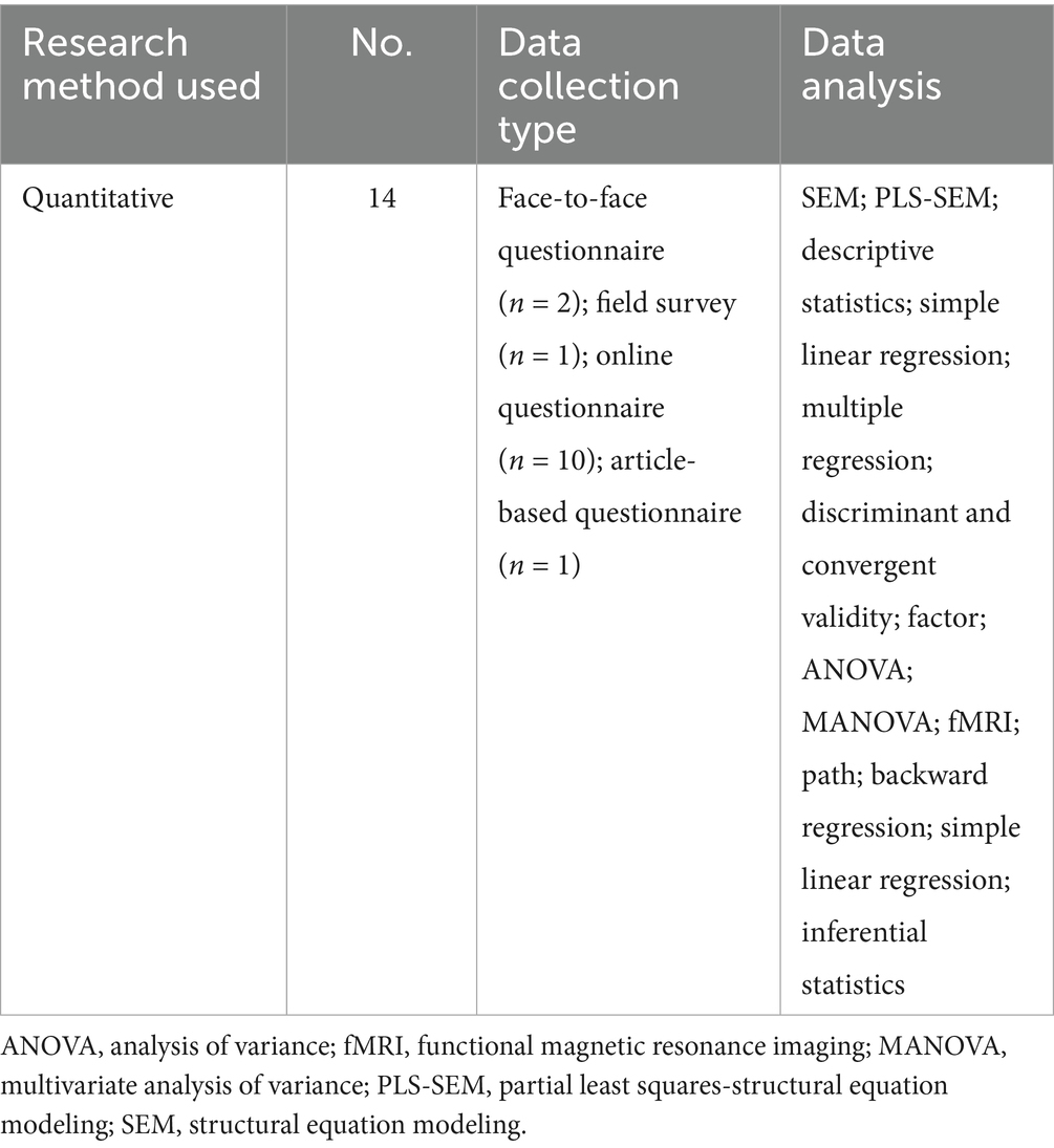 Prior literature has adopted various research methods to empirically examine the associations between motivations and barriers and Chinese consumers’ purchasing behavior toward organic food. McLeod et al. (2016) suggest that empirical articles should be classified as qualitative, quantitative, and mixed methods. The current systematic literature review also utilized a similar classification. The research articles were categorized as qualitative when it emphasized the description and generation of understanding of the environment and context of the phenomenon. On the other hand, the quantitative study highlights the relationship among factors through observable and numerical data collection (Hoehle et al., 2012). The quantitative methods consist of survey and experiments. The surveys were the most widely used method, selected by more than half of the studies. In contrast, experiments were the least commonly used method. This method needs control and manipulation over variables for designing treatment (Puska et al., 2018). This review includes 14 chosen publications, all using quantitative methodologies (see Table 5). All of the 14 studies collected questionnaires online or offline in major cities in China, such as Beijing, Shanghai, and Guangzhou, using the acquired data for further structural equation modeling analysis.