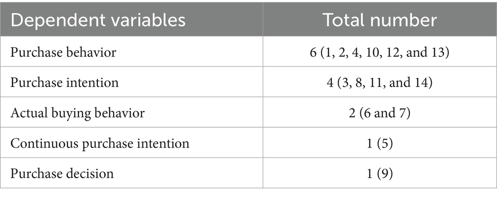An overwhelming number of empirical studies (n = 14) examined the association between motives, barriers, and consumer purchase decisions. These 14 studies utilized different dependent variables to examine their association with motives or barriers (see Table 6). Purchase behavior (n = 6) and intention (n = 4) were the most utilized dependent variables.