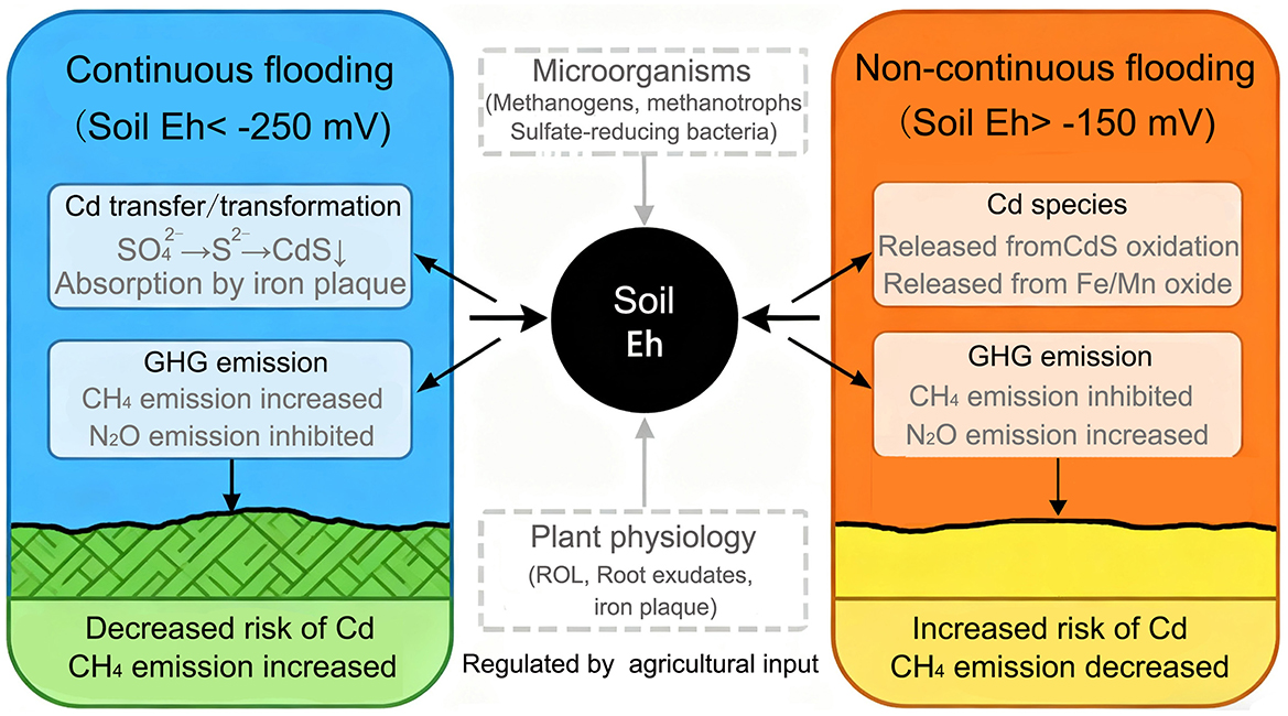 The alternating flooding-drying hydrological regimes in rice paddies drive dynamic changes in soil Eh, which mediate the trade-off relationships between GHG emission and Cd availability. This trade-off is mainly regulated by agricultural management measures, with water management and agricultural input application as core drivers. The conceptual diagram was depicted in Figure 1.