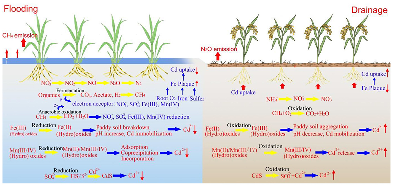 Soil Eh is the core driving factor and is positively correlated with Cd. Partial correlation analysis shows that sulfur in pore water is positively correlated with Cd (Cd is released from sulfide oxidation) (Seyfferth et al., 2025). For water management, continuous flooding (CF) keeps soil in a long-term anaerobic state (Eh < −250 mV). Low Eh promotes the formation of insoluble CdS precipitates to reduce Cd bioavailability (Wang et al., 2020), but it also provides favorable conditions for methanogens to decompose organic matter, significantly increasing CH4 emissions while inhibiting N2O emissions (Wang Y. et al., 2023). In contrast, alternate wetting and drying (AWD) or mid-season drainage (MD) improves soil aeration, raising Eh above −150 mV. This inhibits methanogen activity, promotes methanotrophs growth, reducing CH4 emissions by 42%-46% (Haque et al., 2016). However, it stimulates nitrification and incomplete denitrification, increasing N2O emissions and reverses Cd immobilization reactions, increasing Cd bioavailability and rice uptake (Carrijo et al., 2022). In a study through laboratory incubation experiments on rice paddy soils under AWD and permanent flooding conditions, it was found that AWD consistently promoted higher N2O fluxes than permanent flooding, with the highest N2O flux of 1.94 mg/m2/h observed under AWD (Abid et al., 2019).