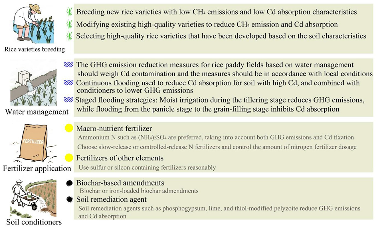 Figure 3. Summary of potential mitigation measures for greenhouse gas emission and cadmium contamination in rice paddy fields.
