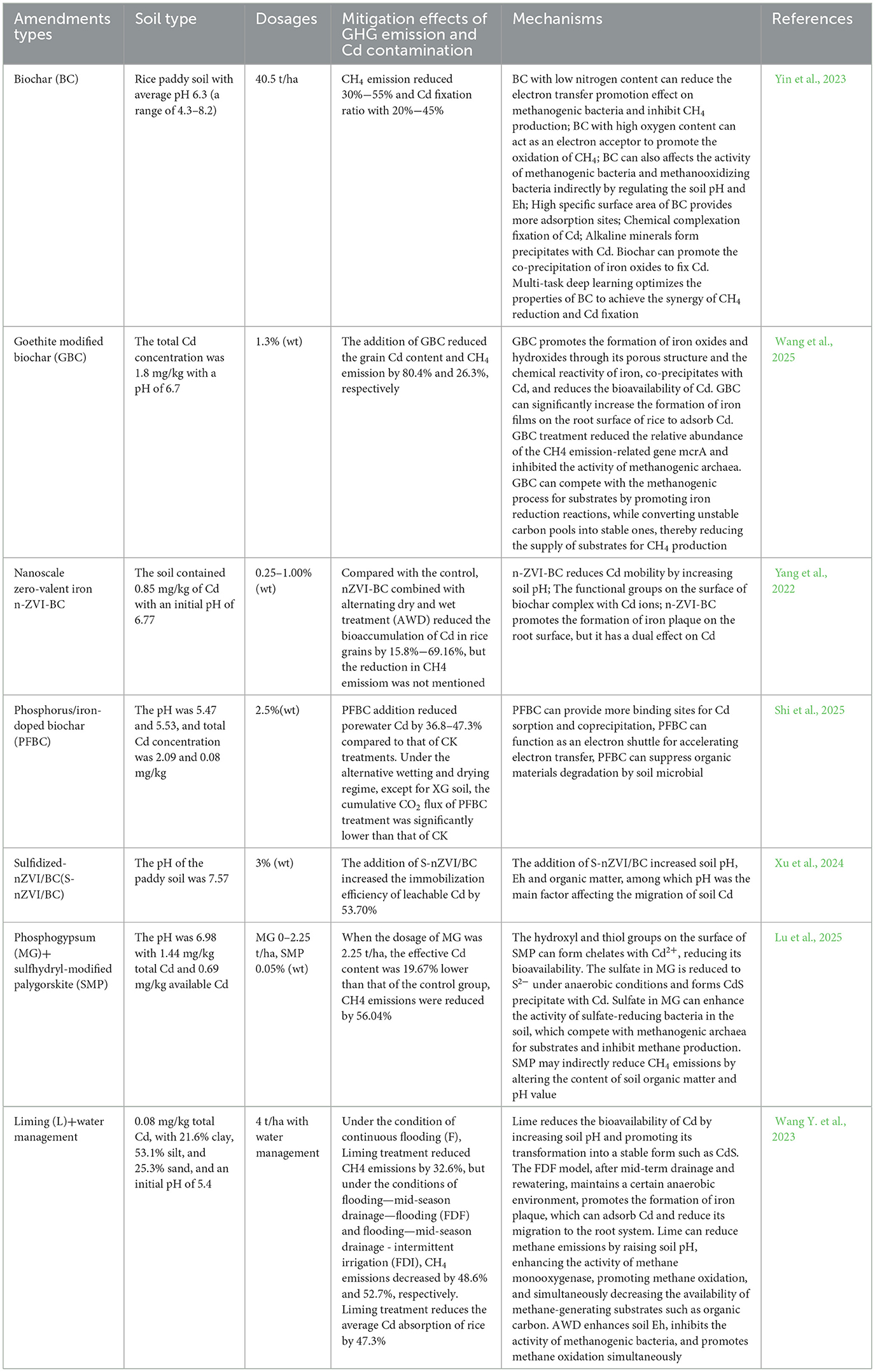 The amendments used for the synergistic mitigation of greenhouse gas emissions and Cd contamination in rice paddy fields are shown in Table 1. Biochar is a widely used soil amendment for reducing CH4 emissions in paddy fields. Biochar application reduce CH4 emissions in paddy fields by affecting soil physical and chemical properties, soil microorganisms, and enzyme activities (Liu et al., 2024). Meanwhile, the porous adsorption, alkalinity, and pH buffering capacity of biochar can reduce the availability of Cd in the soil (Lu et al., 2022; Islam et al., 2024; Meng et al., 2025). Through artificial intelligence-assisted multi-task deep learning models, the synergistic mitigation of biochar on CH4 emission reduction and Cd pollution in paddy fields can be achieved (Yin et al., 2023). Iron-loaded modification of biochar is an important modification measure for the synergistic remediation of GHG emissions and heavy metal pollution. Iron-modified biochar can not only increase soil available potassium, alkaline hydrolyzable nitrogen, and soil organic carbon, but also the goethite-modified biochar can further enhance the formation of iron plaques on the root surface, reducing the Cd content in rice by 80.4% (Wang et al., 2025). Biochar-supported nanoscale zero-valent iron (n ZVI-BC) is also increasingly used for Cd immobilization, which can reduce Cd accumulation in rice grains under the AWD water management mode (Yang et al., 2022), achieving synergistic mitigation of GHG emissions and Cd contamination. The mitigation mechanisms of Cd contamination using biochar-nanoparticle composites including immobilizing Cd through physicochemical processes such as adsorption, complexation, and precipitation to reduce its bioavailability, restructure soil microbial communities by enriching metal-resistant taxa and enhancing functional pathways like glutathione metabolism and nitrogen fixation, and reprogram maize transcriptomic networks to upregulate antioxidant enzyme activities and modulate phytohormone signaling (Yasin et al., 2025). However, n ZVI-BC is prone to passivation and agglomeration, and has poor electron transfer. Biochar-supported sulfidated nanoscale zero-valent iron (S-n ZVI/BC) can increase soil pH, Eh, and organic matter, among which pH is the main factor affecting the mobility of soil Cd (Xu et al., 2024). The combined use of amendments with CH4 emission reduction and Cd remediation is also an important means to achieve synergistic remediation of GHG emissions and Cd pollution. For example, the combined use of phosphogypsum and the cadmium remediation agent mercapto-modified palygorskite can effectively reduce Cd pollution in brown rice and CH4 emissions in paddy fields (Lu et al., 2024, 2025). In acidic paddy fields, water management combined with lime application can reduce CH4 emissions without increasing Cd absorption by rice (Wang Y. et al., 2023). The potential secondary environmental issues of some amendments cannot be overlooked. For example, nZVI-BC is prone to passivation and agglomeration, reducing its long-term effectiveness, and some modified biochars may have the risk of heavy metal leaching—and there is no discussion on unified dosage standards for amendments, resulting in inconsistent application effects in different soil types.