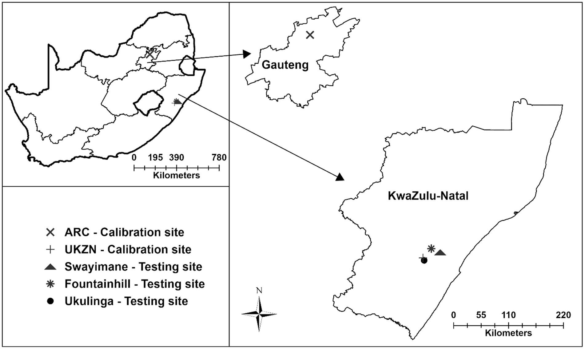 Figure 1. Experimental sites selected for model recalibration and testing of sweet potato and taro in South Africa.