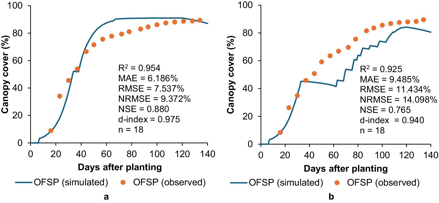 Figure 2. Simulated versus observed canopy cover development for OFSP grown under (a) unstressed and (b) stressed conditions in a greenhouse at UKZN during the 2022/23 season.