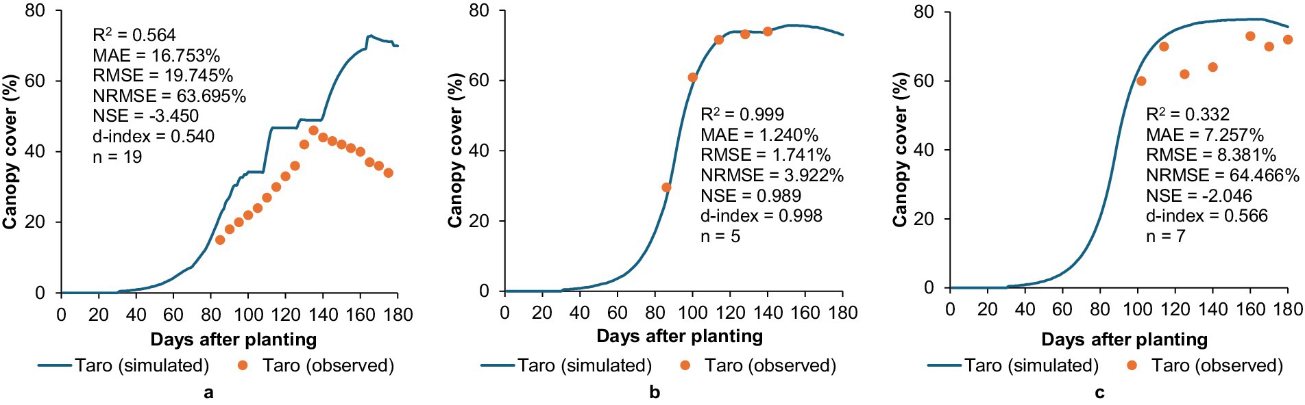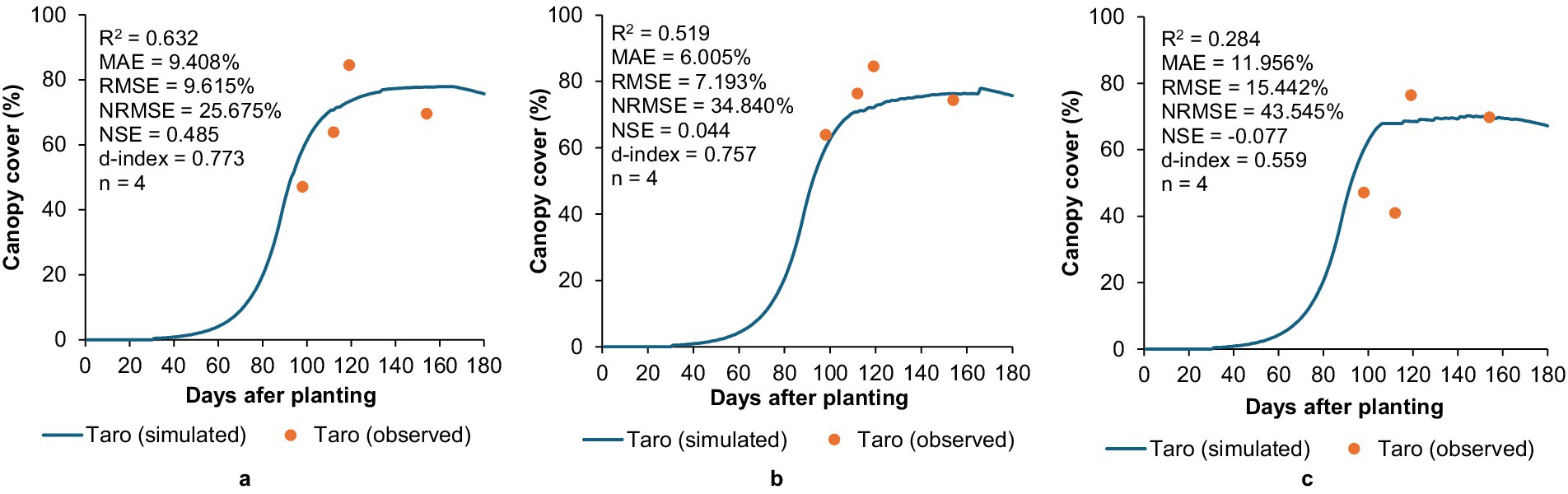 Figure 7. Validation results showing the comparison between simulated and observed canopy cover development for taro at (a) fountainhill, (b) swayimane, and (c) Ukulinga.