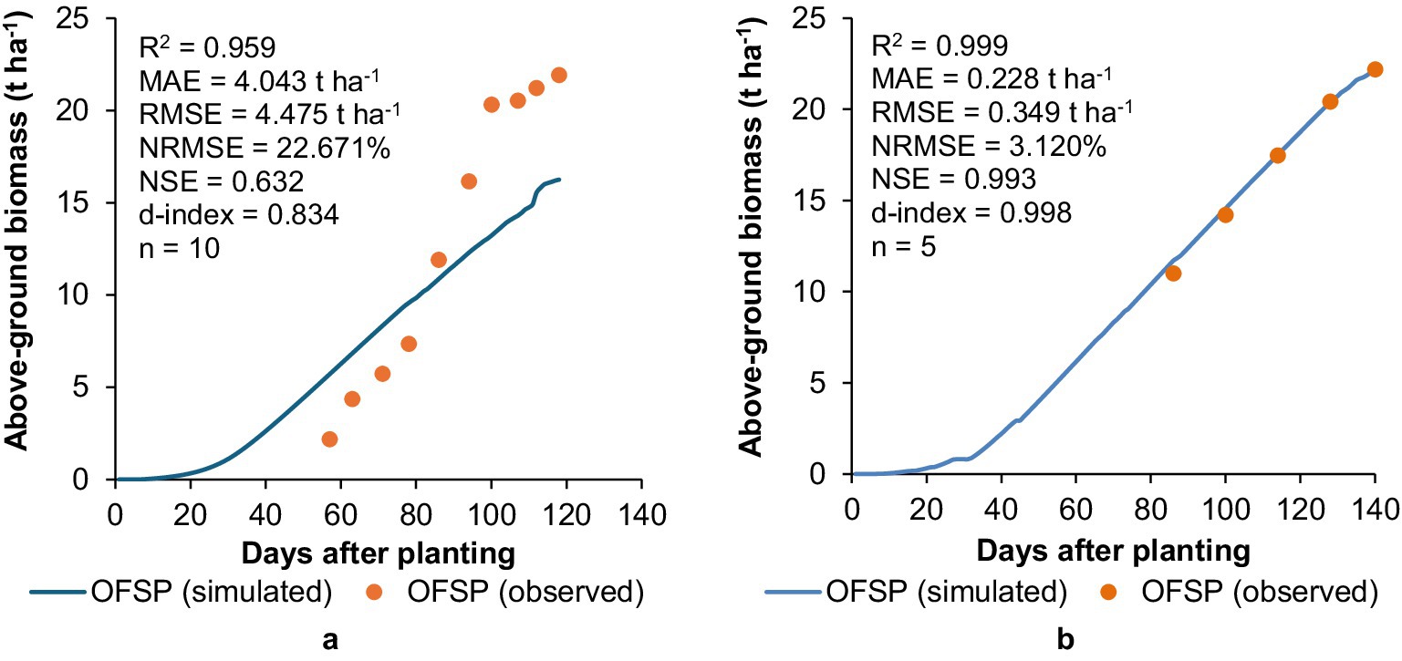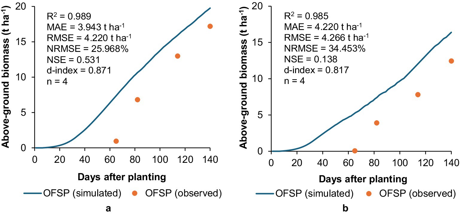 Figure 4. Simulated versus observed above-ground biomass accumulation for OFSP grown under (a) unstressed and (b) stressed conditions in a greenhouse at UKZN during the 2022/23 season.