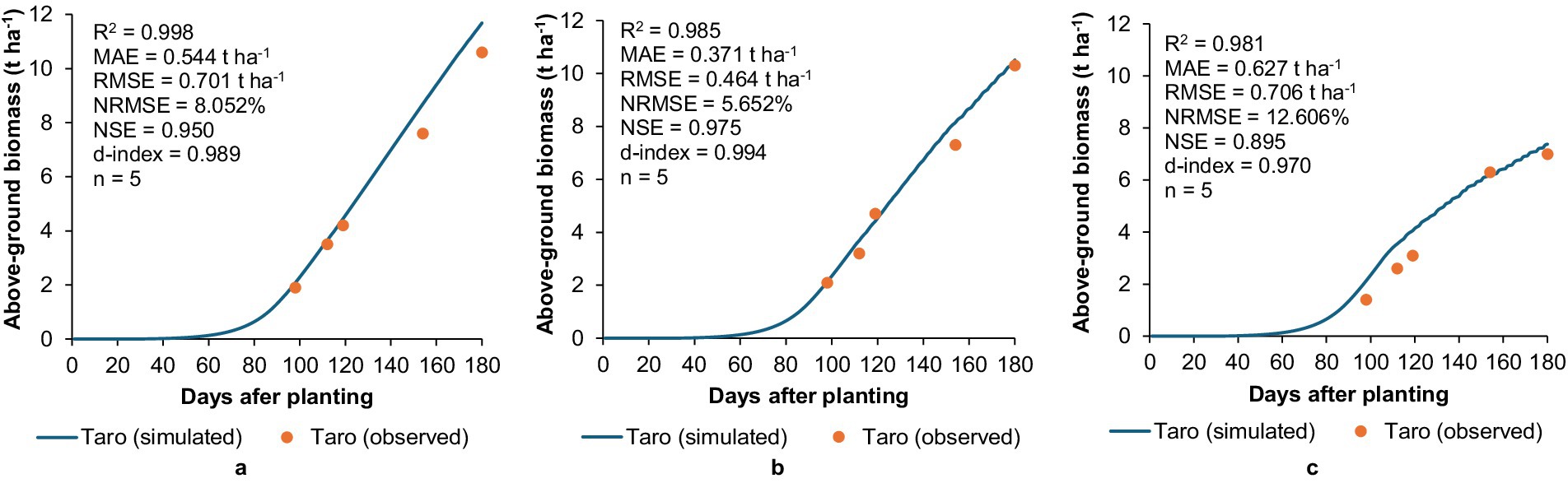 Figure 5. Simulated versus observed above-ground biomass production for taro under (a) unstressed, (b) moderately stressed, and (c) stressed conditions at Roodeplaat during the 2010/11 season.