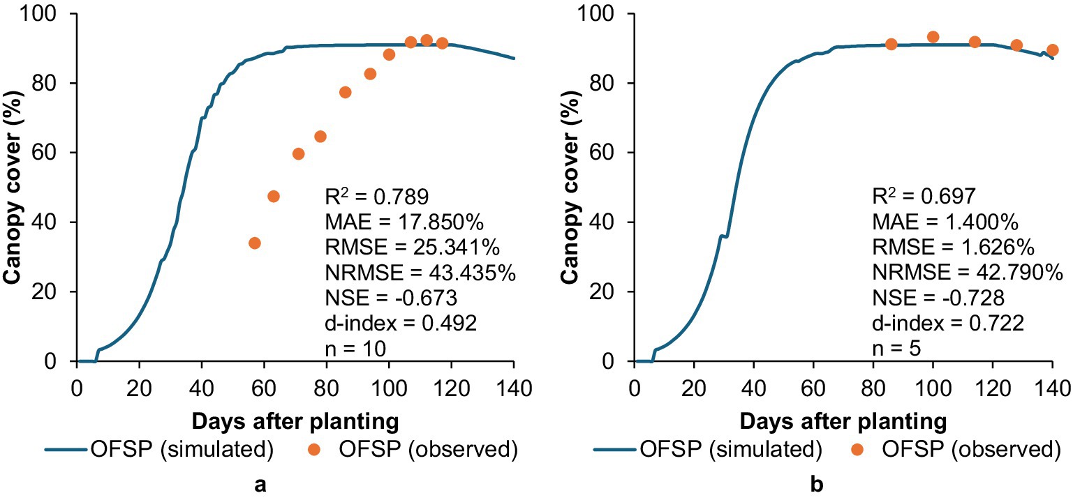 Figure 6. Validation results showing the comparison between simulated and observed canopy cover development for OFSP grown at (a) Fountainhill and (b) Swayimane under rainfed conditions.
