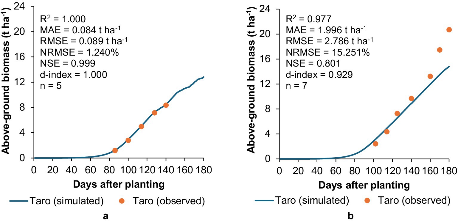 Figure 9. Validation results showing a comparison between simulated and observed above-ground biomass accumulation for taro at (a) swayimane and (b) ukulinga.