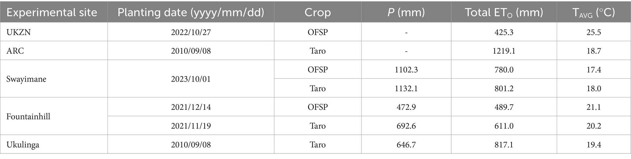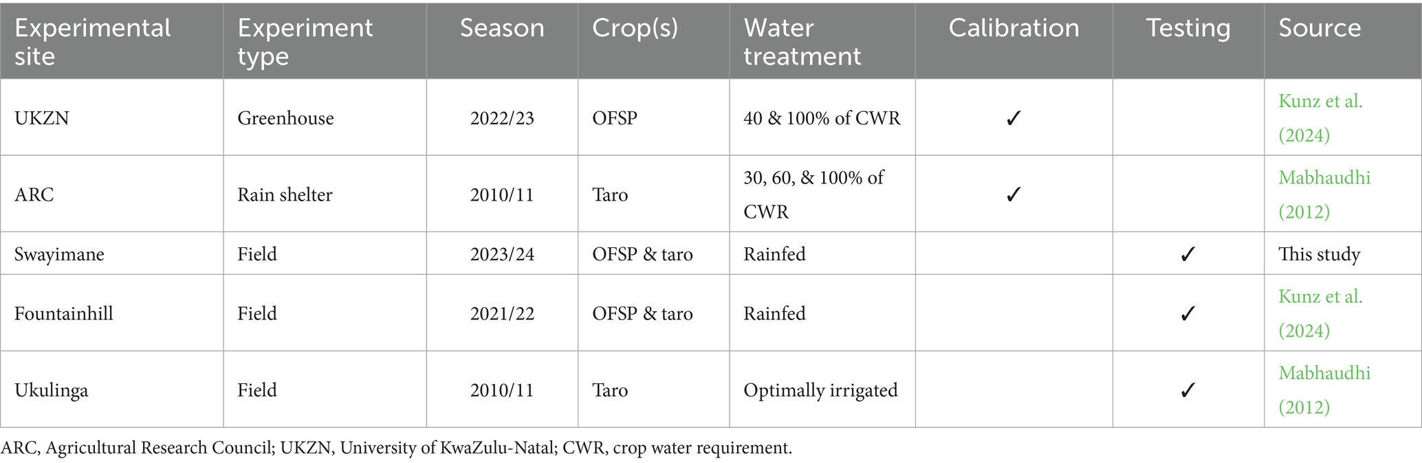Table 1. Summary of experimental datasets obtained for model calibration and testing of sweet potato and taro in South Africa.