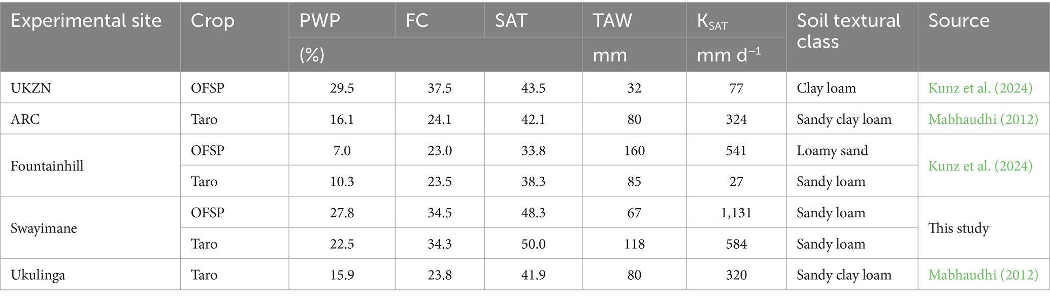 Data provided in Table 2 were used to develop an input soil (. SOL) file for each experimental site. These include the soil water content at permanent wilting point (PWP), field capacity (FC), and saturation (SAT), as well as total available water (TAW), and saturated hydraulic conductivity (KSAT). For the Swayimane validation site, soil samples were collected from 0.15, 0.30, and 0.60 m depths using an auger. Soil texture was determined in the soil and water laboratory at UKZN using the hydrometer method (Bouyoucos, 1962). Soil water retention curves were obtained using controlled outflow pressure apparatus and fitted with the Van Genuchten equation (Van Genuchten, 1980), from which soil water content at FC and PWP was estimated at −10 kPa and −1,500 kPa, respectively. KSAT was measured using the constant-head permeameter method (Klute, 1965).