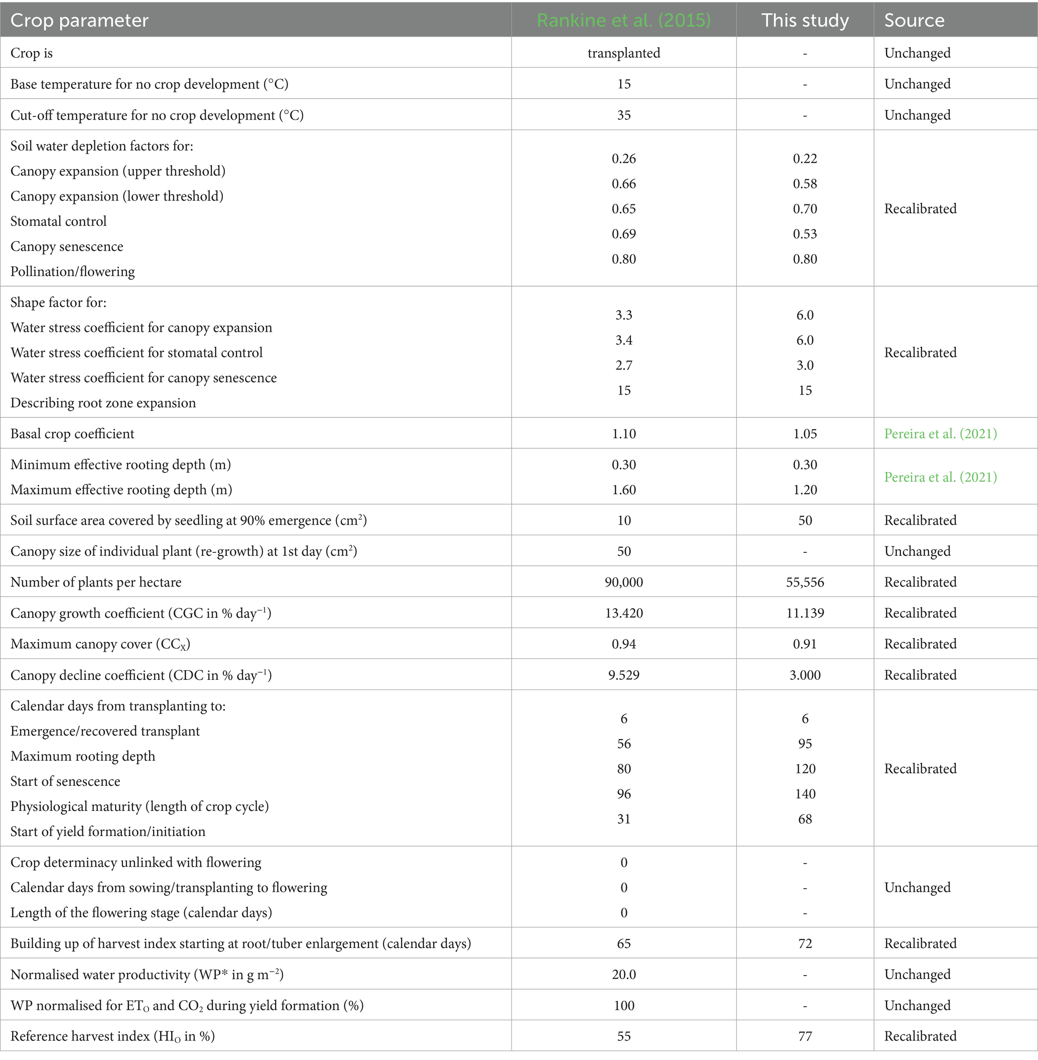 Growth and yield data from the unstressed water treatment (100% of crop water requirement or CWR in mm) were used for recalibration. CWR is the amount of irrigated water required to meet a crop’s maximum evapotranspiration demand (ETC in mm). The calculation of CWR is based on FAO’s Penman-Monteith equation to calculate ETO (Allen et al., 1998), which is then adjusted using a crop coefficient (KC) as follows: