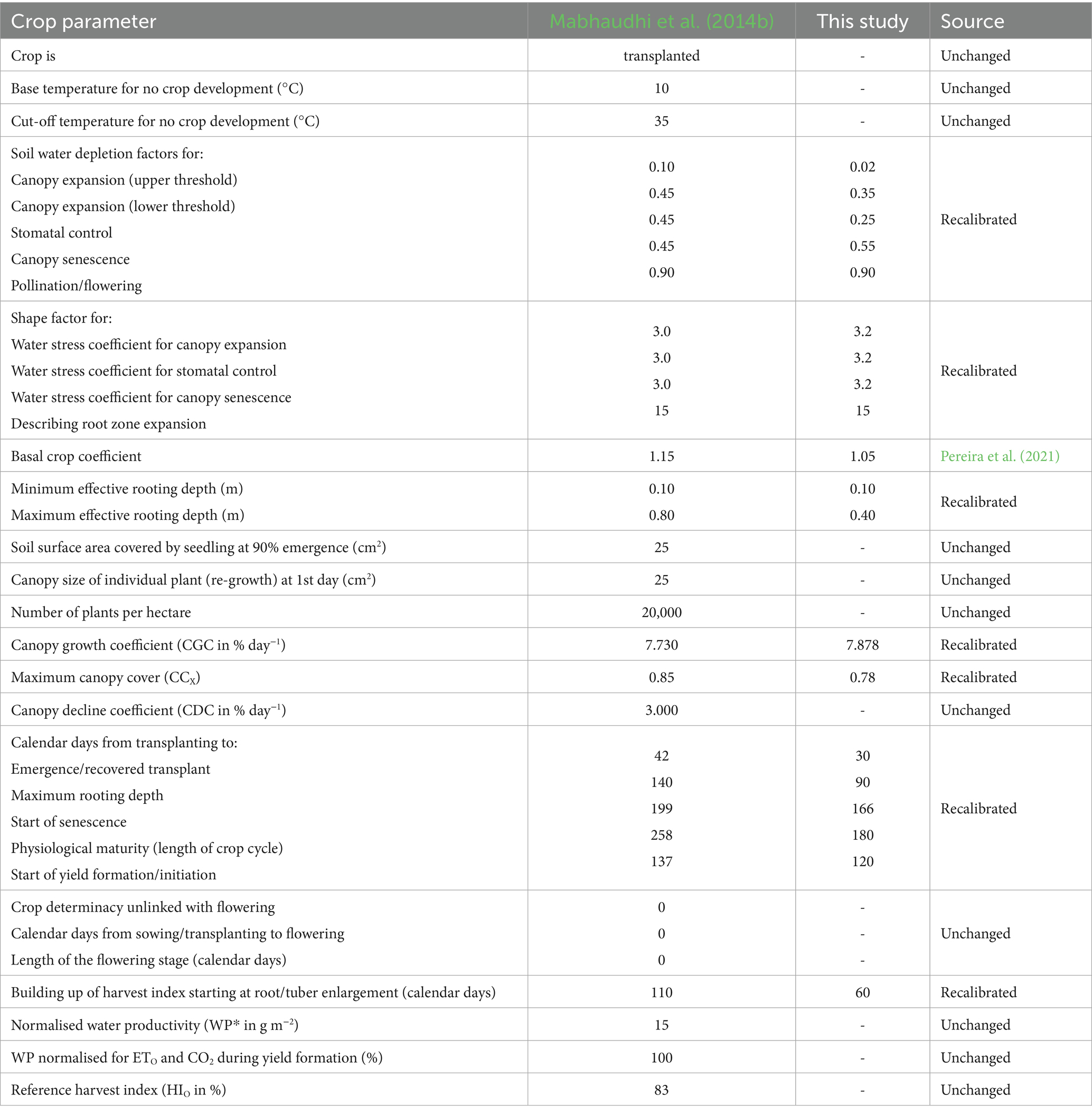 Using guidelines developed by Steduto et al. (2012), model recalibration involved fine-tuning specific parameters initially developed by Rankine et al. (2015) and Mabhaudhi et al. (2014b) to represent local landrace and growing conditions adequately. In AquaCrop, crop parameters are classified as conservative (stable across environments and management practices) or non-conservative (vary with cultivar., location, and management). While conservative parameters are generally stable (FAO, 2023), they were refined in this study to account for the high genetic variability among local landraces. For example, the adjustment of HIO was done using observations from the non-stressed (i.e., fully irrigated) treatments (cf. Table 1) to ensure that AquaCrop predicts the highest yield under well-watered conditions (FAO, 2023). Other conservative parameters linked to water stress responses (e.g., soil water depletion factors and associated shape factors for canopy expansion, stomatal closure, and senescence) were also fine-tuned. Parameters intrinsic to crop species, such as the cut-off temperature for development, were retained to avoid compromising accuracy. For parameters that were not measured (e.g., basal crop coefficient), representative values were sourced from literature (e.g., Pereira et al., 2021).