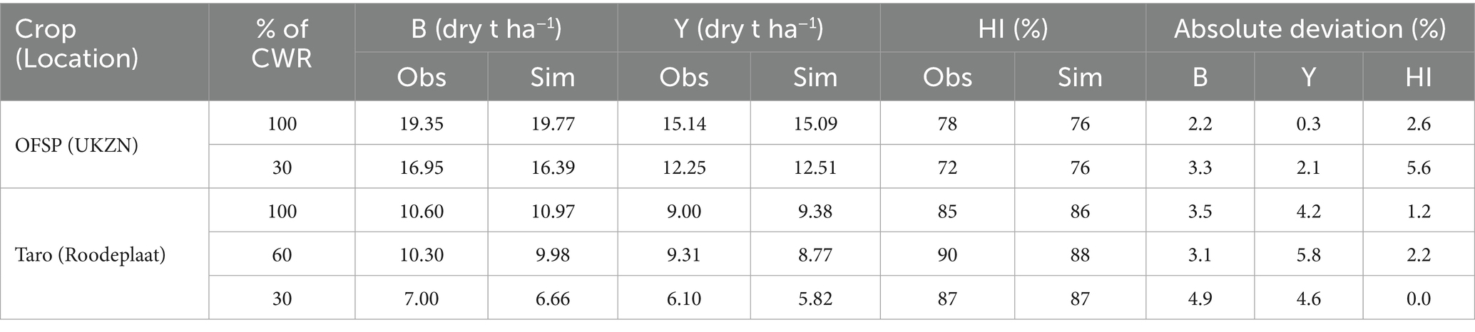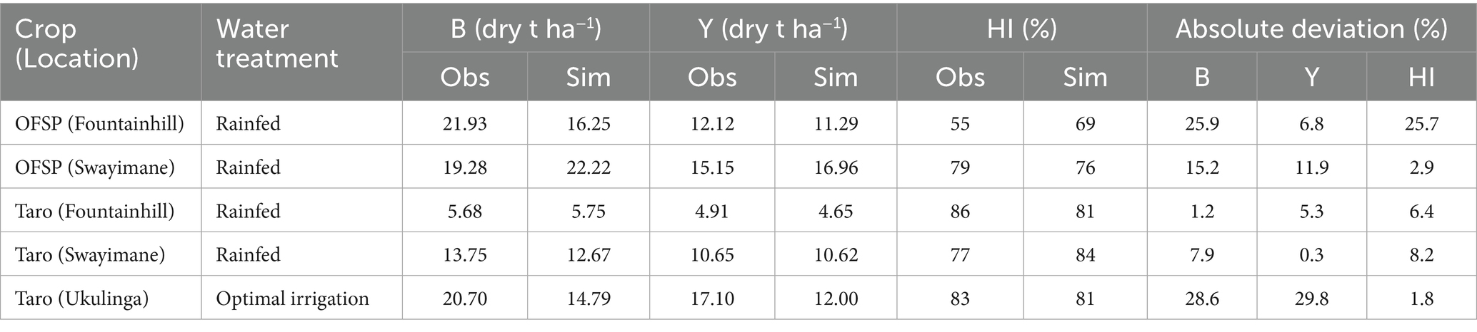 However, larger absolute deviations (15.2–28.6%) in final above-ground biomass were identified for OFSP at Fountainhill and Swayimane, and for taro at Ukulinga. This indicates the model may inadequately simulate final biomass across different locations. AquaCrop predicted the HI of OFSP at Swayimane and taro at Fountainhill, Swayimane, and Ukulinga with high accuracy (Table 7). However, the model failed to simulate the HI for OFSP at Fountainhill accurately. Given that HI directly affects yield estimation, inaccuracies in HI modelling under certain site conditions may undermine AquaCrop’s utility for harvest predictions unless these specific weaknesses are addressed in future recalibrations.