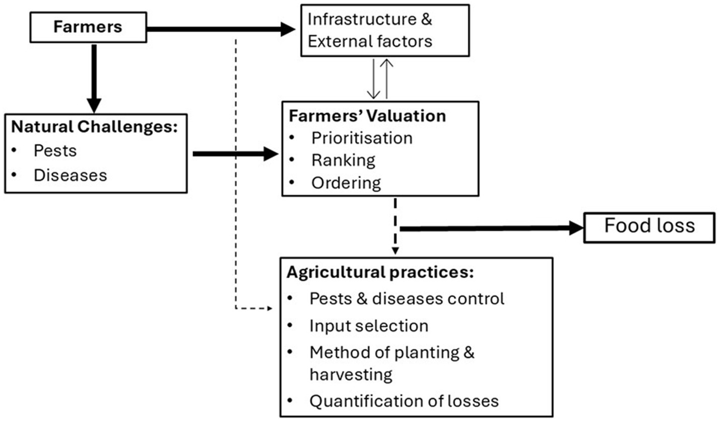 Figure 1. Framework showing the nexus between farmers’ challenges, valuation, farming practices, and food loss.