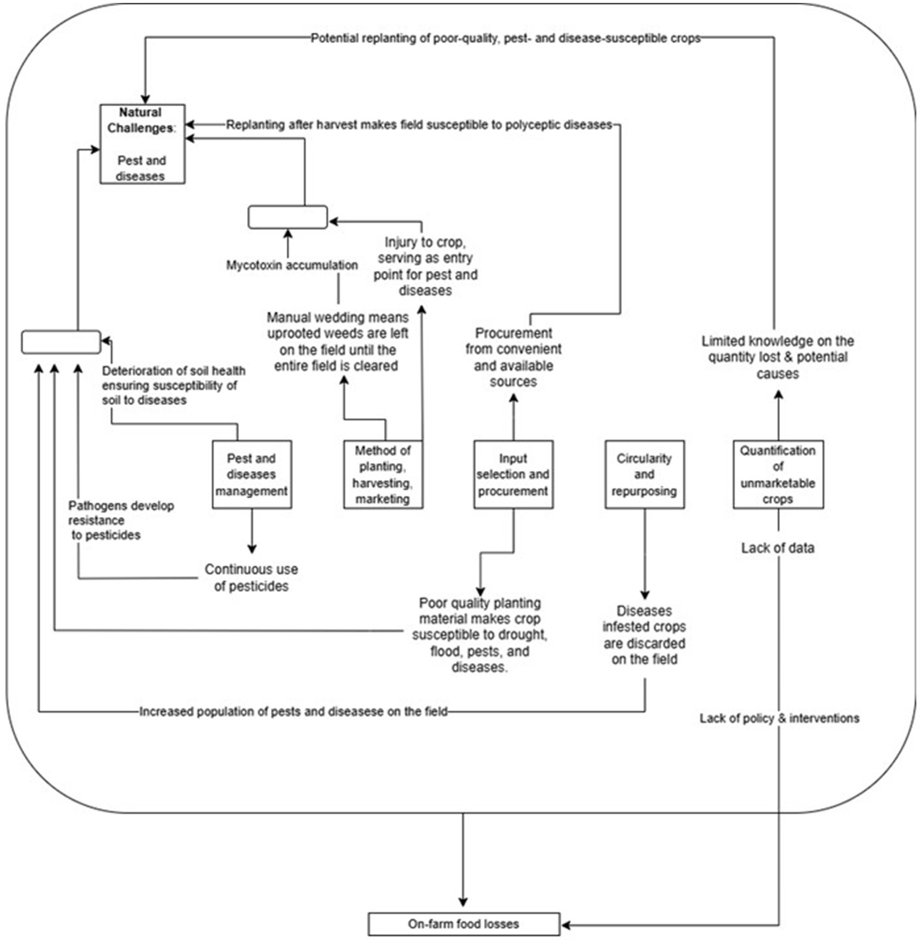 Using data from a researcher-facilitated Focus Group Discussion (FGD) with nine maize, cassava, and rice farmers in Ondo State, Nigeria, this study contributes novel insights into how farmers’ evaluations of risk, need, and feasibility shape their everyday decisions. The findings demonstrate that farming practices are not isolated actions, but nodes in a web of interdependent responses to persistent challenges. The following sections elaborate on these dynamics by exploring: (1) the nexus between agricultural challenges, farming practices, and food loss; (2) the valuation logics underlying farmers’ decision-making; and (3) leverage points for designing context-responsive food loss interventions.