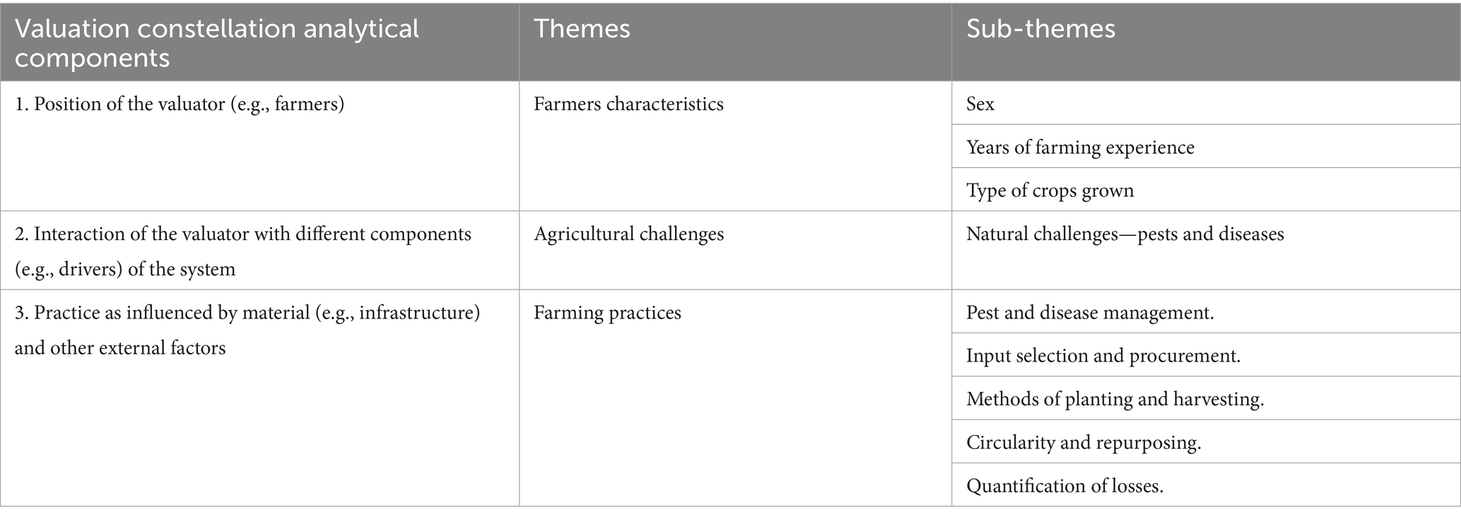 As illustrated in Table 1, three themes were identified, each corresponding to the components of the valuation constellation analysis: the position of the valuator, their relationship to other system components, and practices influenced by infrastructure and external factors. The first theme pertains to the characteristics of the actors (farmers), including their years of experience and the types of crops they cultivate. The second theme addresses the predominant agricultural challenge as elements of food systems and the interaction of the valuator (farmers) with these various elements. The third theme concerns farming practices shaped by material and other external influences. The discussion section further explores the implications of these interactions for food loss and the efficiency of food systems.
