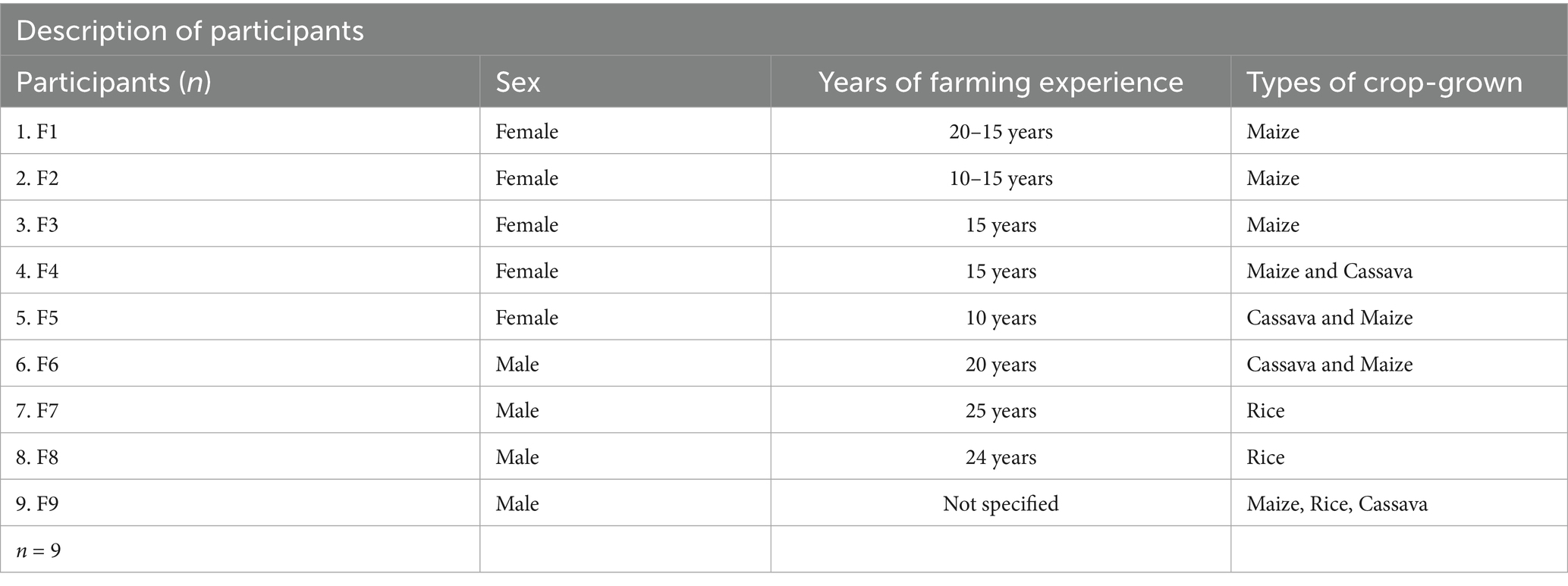 To ensure robust representation across key demographic and experiential strata, the selected community shared similar agro ecological zones and cultivated the targeted crops, rice, maize, and cassava, aligning with the study’s thematic focus. A deliberate emphasis was placed on gender inclusivity, with a majority of participants being female, thereby grounding the findings in the lived realities of women farmers. Rather than using age as a stratification criterion, the study prioritised farming experience, selecting participants with a minimum of 10 years in practice. This approach allowed for the inclusion of both younger and older farmers, capturing a diverse range of insights shaped by long-term engagement in agriculture.