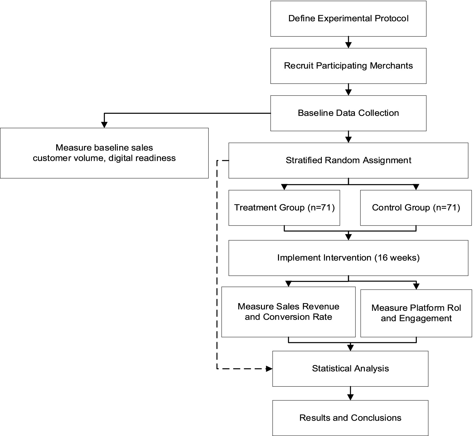 The randomization process adopted a stratified randomization method to ensure the balance of key features between the experimental group and the control group (Kernan et al., 1999). As shown in Figure 1, the entire experimental process starts with the determination of the experimental plan, goes through merchant recruitment, baseline data collection, random allocation, intervention implementation, effect measurement, and finally statistical analysis and conclusion drawing, forming a complete experimental closed loop. The samples were divided into six levels based on the business types (accommodation, catering, experience projects) and scales (with the median annual turnover as the boundary) of the merchants. Within each level, merchants are assigned to the experimental group (n = 71) or the control group (n = 71) using a sequence of random numbers generated by the computer, with an allocation ratio of 1:1. Stratified randomization is particularly appropriate for this study given our relatively small sample size (n = 142) and the need to ensure balance across important baseline characteristics (Kernan et al., 1999). The randomization process was carried out by independent third-party statisticians. Neither the research team nor the participating merchants knew the specific allocation situation before the grouping results were announced, ensuring the validity of blind allocation.