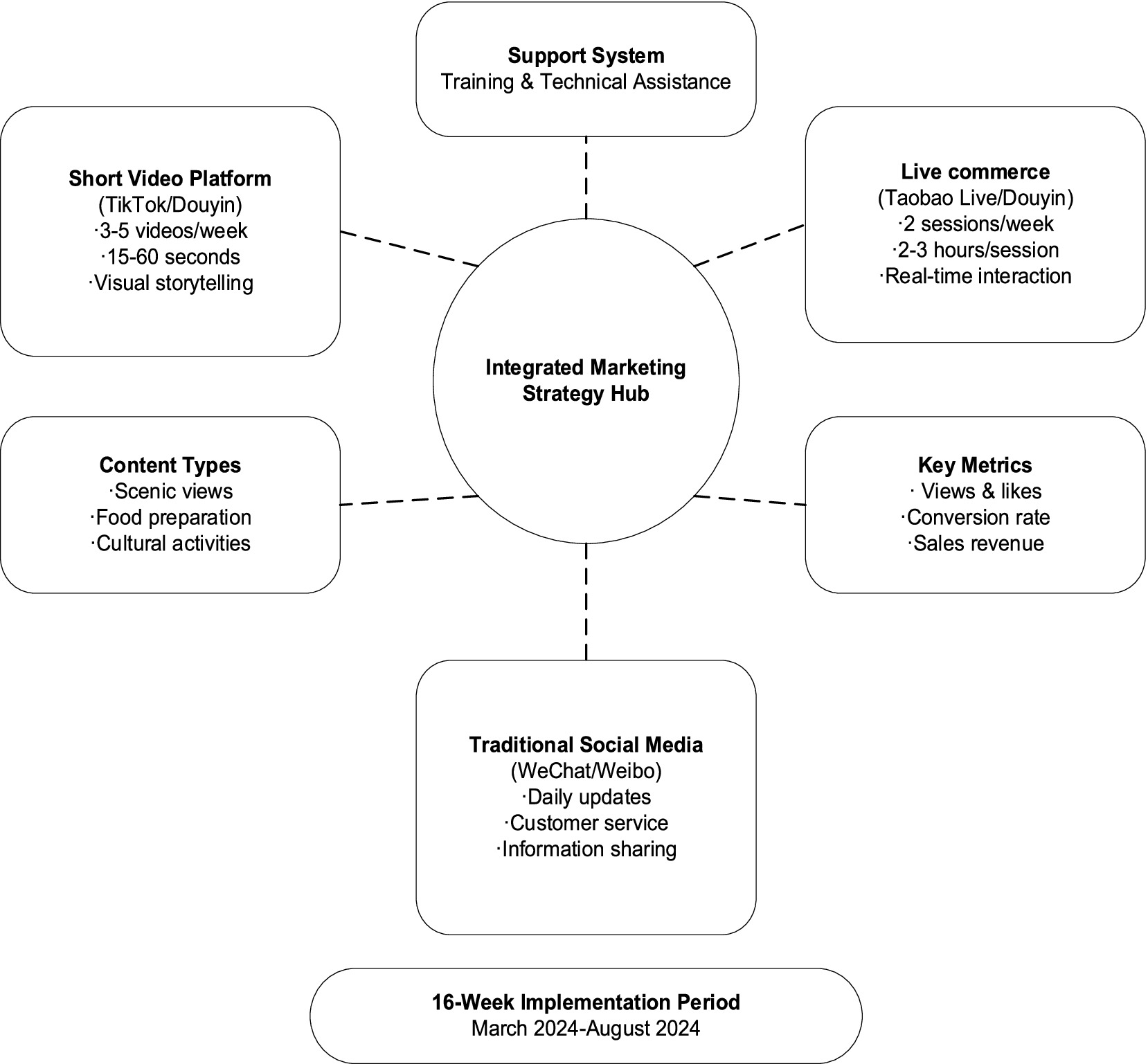 The implementation schedule fully takes into account the seasonal characteristics of rural tourism and the cumulative effect of social media marketing. As shown in Figure 2, the entire intervention framework takes the comprehensive marketing strategy center as its core and coordinates the content creation and release of the three major platforms. The intervention period lasts for 16 weeks, covering the main tourist periods in both spring and summer. In terms of implementation intensity, the research adopts a progressive strategy. The first 4 weeks are the adaptation period, during which merchants, under the guidance of a professional team, become familiar with the operations of various platforms and content creation techniques. Weeks 5–12 are the intensive period, during which the established release frequency and interaction strategy will be fully implemented. The last 4 weeks are the optimization period, during which the content direction and release timing will be adjusted based on the feedback from the previous data. This phased arrangement not only avoids the excessive operational burden on merchants but also ensures the gradual accumulation of Marketing effects.