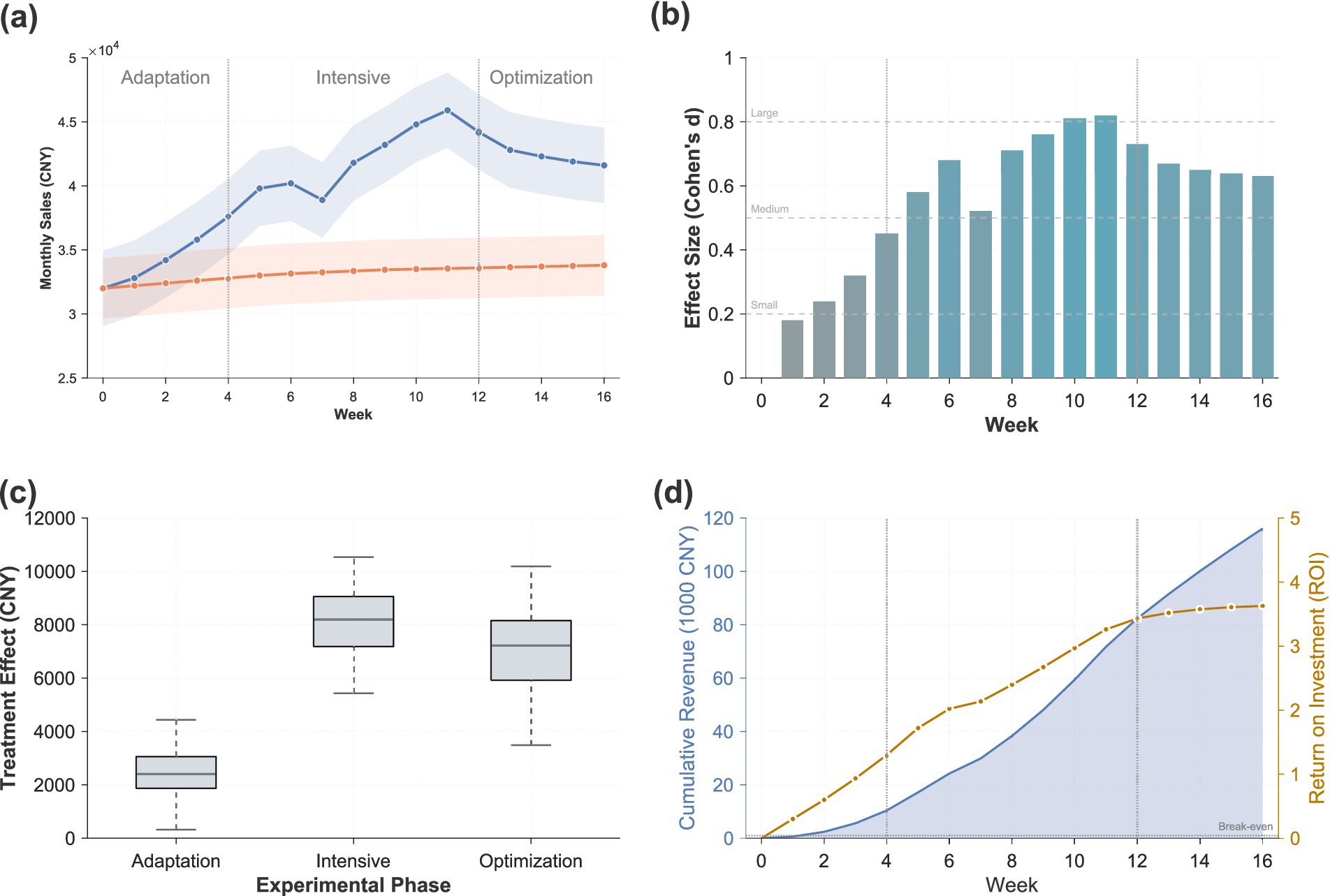 Figure 3. Treatment effects analysis. (a) Weekly sales trends comparing treatment and control groups across 16 weeks; (b) Effect size (Cohen’s d) progression showing weekly treatment effects; (c) Box plots of treatment effects across experimental phases (adaptation, intensive, optimization); (d) Cumulative revenue and return on investment over the 16-week period.