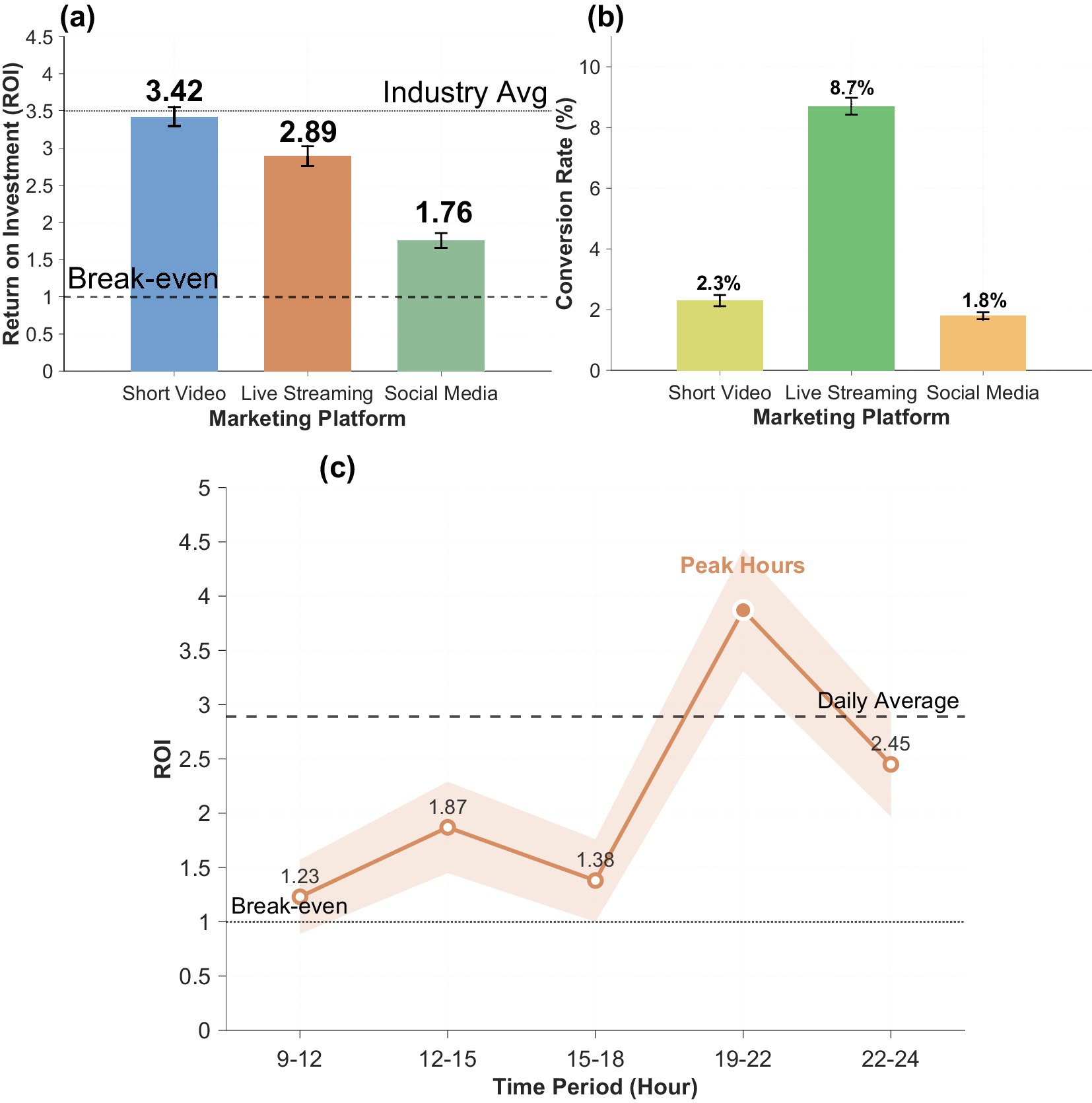 Figure 4. Platform marketing performance metrics. (a) Return on investment comparison across marketing platforms (Short Video, Live Streaming, Social Media); (b) Conversion rate comparison across the three marketing platforms; (c) ROI variation across different time periods throughout the day.