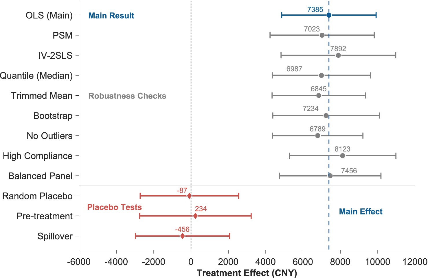 The robustness test includes three aspects: Firstly, propensity score matching is used to verify the validity of randomization; Secondly, a placebo test was conducted to construct a zero distribution through 1,000 random real assignments; Thirdly, conduct sensitivity analysis, including eliminating outliers, adjusting the standard error of clustering and estimating the Bootstrap confidence interval, to ensure that the conclusion does not rely on specific model Settings.