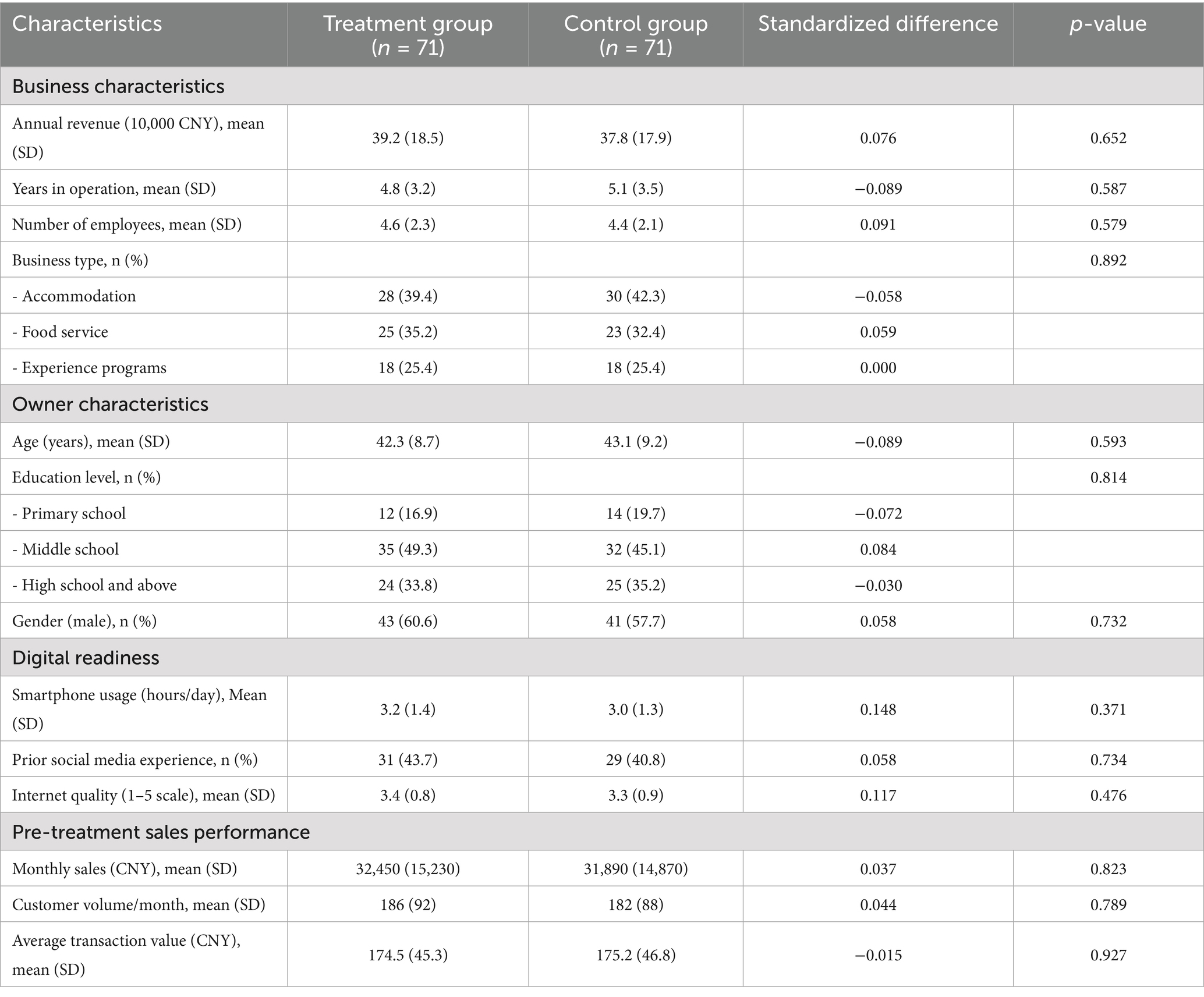 Sample selection follows strict inclusion and exclusion criteria. Participating merchants must have basic Internet access conditions and the ability to use smartphones to ensure they can implement social media marketing strategies. Merchants need to have at least 1 year of business history and a relatively stable supply of products to eliminate the interference of the new opening effect. Meanwhile, the merchants had not carried out large-scale marketing activities within the 3 months prior to the experiment to avoid the superimposition of marketing effects. With the assistance of the local tourism department, the research team initially screened out 186 eligible merchants. After a detailed baseline survey and confirmation of their willingness, 142 merchants finally agreed to participate in the experiment. The average annual turnover of these merchants is 385,000 yuan, and the number of employees ranges from 2 to 8. Among them, 68% of the operators are aged between 35 and 50, which is quite representative.
