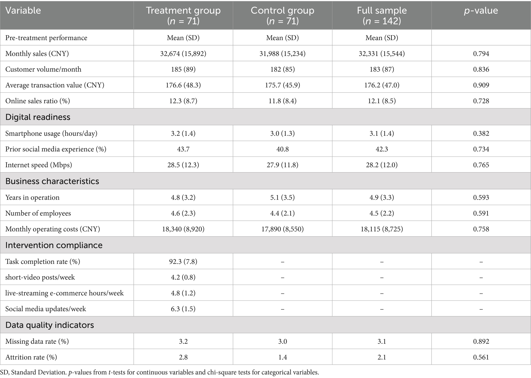 The comparison results of baseline characteristics showed that both the experimental group and the control group achieved a good balance in all key indicators. As shown in Table 1, the standardized differences were all less than 0.15, indicating that randomization successfully achieved inter-group equilibrium. There was no significant difference between the two groups in terms of digital readiness and early sales performance (all p values >0.35), which provided a solid foundation for subsequent causal inference. It is particularly worth noting that the two groups of merchants were highly similar in terms of average monthly sales (32,450 yuan in the experimental group vs. 31,890 yuan in the control group, p = 0.823) and customer flow (186 person-times in the experimental group vs. 182 person-times in the control group, p = 0.789), eliminating the potential impact of baseline differences on the experimental results. In addition, the attrition rate of merchants was kept at a relatively low level. During the experiment, only three merchants (2.1%) withdrew from the study, and the reasons for their withdrawal were not related to the experimental intervention. They were mainly due to personal health or family reasons. This low attrition rate enhanced the internal validity of the research results.