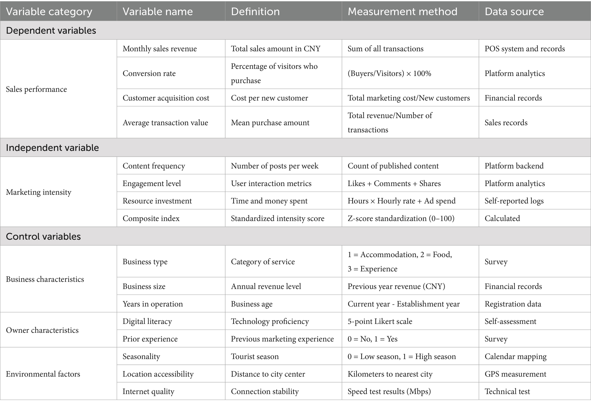 The operational definition of the intensity of independent variable marketing intervention includes three core dimensions: content publication frequency, interaction participation, and resource input level. The frequency of content release is statistically analyzed based on the release records in the backends of various platforms, including the number of short-videos, the duration of live broadcasts, and the number of updates on social media. The measurement of interaction engagement covers indicators such as the number of likes, comments, shares, and the number of viewers in the live stream room. These data can be directly obtained from the platform’s analysis tools. The level of resource input quantifies the time and money that merchants invest in social media marketing, including the number of hours spent on content creation each week, the cost of hiring professionals, and the expenditure on paid promotion. To standardize measurements in different dimensions, the study adopted the Z-score standardization method to construct a comprehensive marketing intensity index with a value range of 0–100, facilitating inter-group comparisons and regression analyses (Banas, 2017). This approach ensures that all marketing effort variables, which are measured on different scales, are converted to a common standardized scale, allowing for meaningful comparison and aggregation. Z-score transformation is particularly useful when combining variables with disparate units and ranges, ensuring that no single dimension dominates the composite index due to its scale.