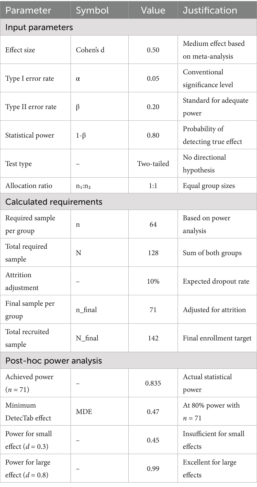 Where and are the mean values of the experimental group and the control group respectively, and represents the combined standard deviation. According to the meta-analysis research in the field of tourism marketing, the average effect size of digital marketing intervention is approximately 0.45–0.55. Therefore, this study conservatively estimates Cohen’s . This moderate effect size is not only of practical significance but also detecTab under real conditions.