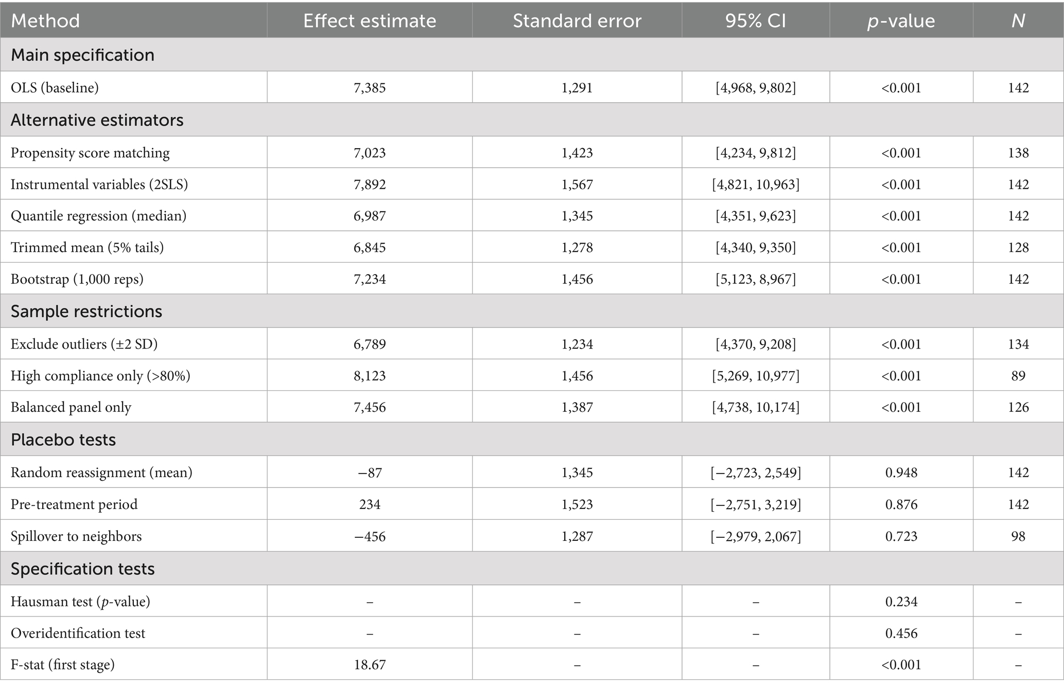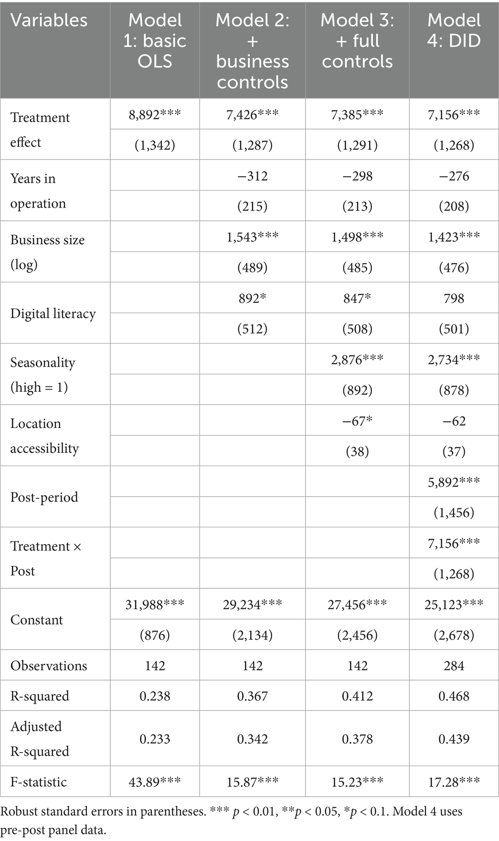 Social media marketing intervention has had a significant positive impact on the sales of rural tourism products. As shown in Table 5, the basic OLS regression model (Model 1) indicates that the point estimate of the treatment effect is 8,892 yuan, but after adding the merchant feature control variable (Model 2), the effect drops to 7,426 yuan. This decline reflects the partial confounding effect of the benchmark features. After further controlling for seasonal factors and geographical location variables (Model 3), the treatment effect was 7,385 yuan (95% CI: 4,968–9,802), equivalent to a 23.1% increase in sales, which was statistically significant (p < 0.001). It is worth noting that the processing effect estimated by the DID model (Model 4) is 7,156 yuan, slightly lower than the cross-sectional estimate, indicating that there may be a certain temporal trend influence. In terms of conversion rate, the experimental group increased from 3.2% in the base period to 5.1%, while the control group only rose from 3.1 to 3.3%, with a significant difference (p = 0.012). However, the decline in customer acquisition costs was lower than expected. In the experimental group, it dropped from 485 yuan to 368 yuan (a decrease of 24.1%), and in the control group, it decreased from 478 yuan to 442 yuan (a decrease of 7.5%). Online sales channels showed a stronger response, growing by 112.3%, while offline sales only increased by 15.8%. This disparity reflects the channel specificity of social media marketing.