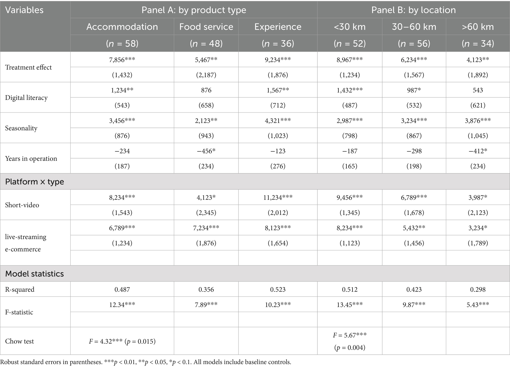 Geographical location significantly influences the realization path and intensity of marketing effectiveness. The processing effect of merchants in the near suburbs within 30 kilometers of the city center was 8,967 yuan (p < 0.001), while that of merchants in the medium distance of 30–60 kilometers was 6,234 yuan (p < 0.01), and that of merchants in the far suburbs over 60 km was only 4,123 yuan (p < 0.05), showing obvious distance attenuation characteristics. As shown in Panel B of Table 6, this difference is not only reflected in the absolute value, but also in the heterogeneity of the marketing mechanism. The advantage of nearby merchants lies in the high conversion rate brought by convenient transportation (7.8% vs. 3.2% in the far suburbs), and the proportion of immediate travel decisions on weekends reaches 42%. Mid-range merchants need stronger content appeal to compensate for the distance disadvantage. Their average video duration (38 s) and production quality are both higher than those of suburban merchants (28 s). Although the merchants in the far suburbs are rich in natural resources, they are faced with the predicament of “visible but inaccessible,” and their marketing effectiveness mainly relies on tourists who plan ahead. Interestingly, there is an interaction between geographical location and seasonality (β = 1,234, p = 0.048). The disadvantage of merchants in the far suburbs shrinks during peak seasons, possibly because tourists are willing to endure longer travel times during peak seasons.