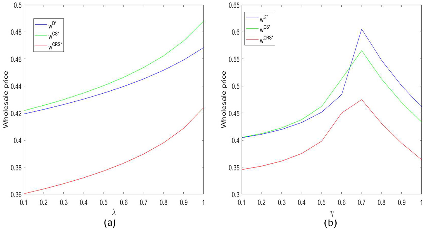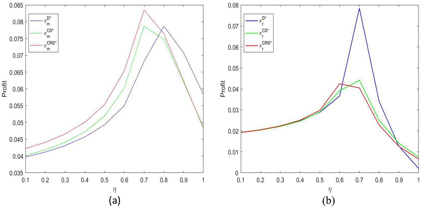 To deeply explore the specific performance of the profit relationship under centralized and decentralized decision-making and seek an effective path to achieve supply chain coordination, the subsequent numerical simulation part of this paper will focus on comparing and analyzing the profit performance under two coordination mechanisms: the cost-sharing contract (CS) and the cost-sharing plus revenue-sharing contract (CRS). By setting reasonable parameter ranges, the impact of different contract modes on supplier profit, retailer profit, and total system profit will be simulated and systematically compared with the profit levels under the decentralized decision mode. This aims to intuitively reveal the effectiveness of the two contracts in incentivizing member collaborative investment and alleviating the “double marginalization” effect, thereby providing clear decision-making basis for supply chain managers to choose the optimal coordination strategy under different scenarios.