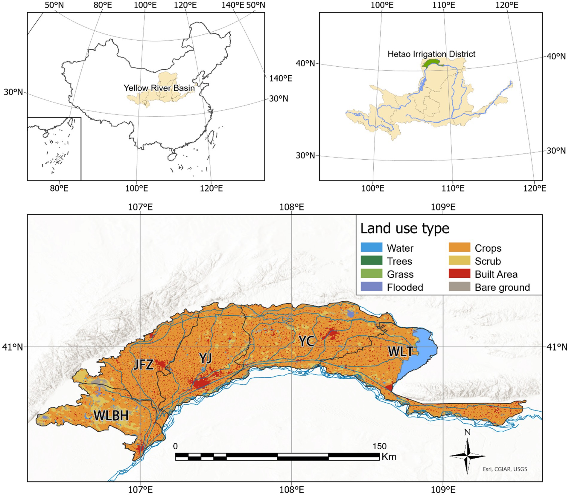 Figure 1. Location and land use types in the Hetao Irritation District (HID). WLBH, JFZ, YJ, YC, and WLT represent the five sub-irrigation districts of Wulanbuhe, Jiefangzha, Yongji, Yichang, and Wulate, respectively. The black lines denote the boundaries among sub-irrigation districts. The blue lines illustrate the irrigation and drainage canals in the HID. Maps created using ArcGIS software. Land use types in HID extracted from Esri 2020 Land Cover. Copyright © 2025 Esri and its licensors. All rights reserved.