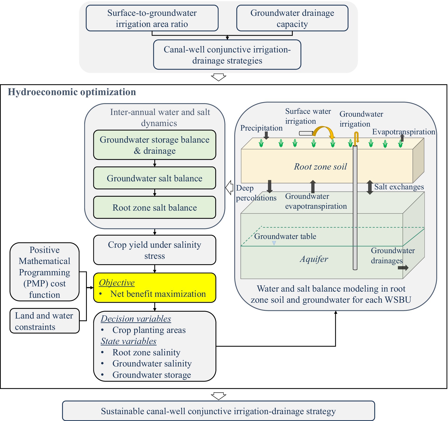 This study underscores that hydroeconomic optimization framework by integrating agro-hydrological process into economic optimization model can provide robust modeling and decision-making tool to reconcile the complex interactions between farmers’ adaptive water-land allocation decisions, water-salt dynamics, agricultural profitability, food security, and water use sustainability, advancing sustainable canal-well conjunctive irrigation and drainage management for arid irrigated agriculture facing water scarcity and soil salinization.