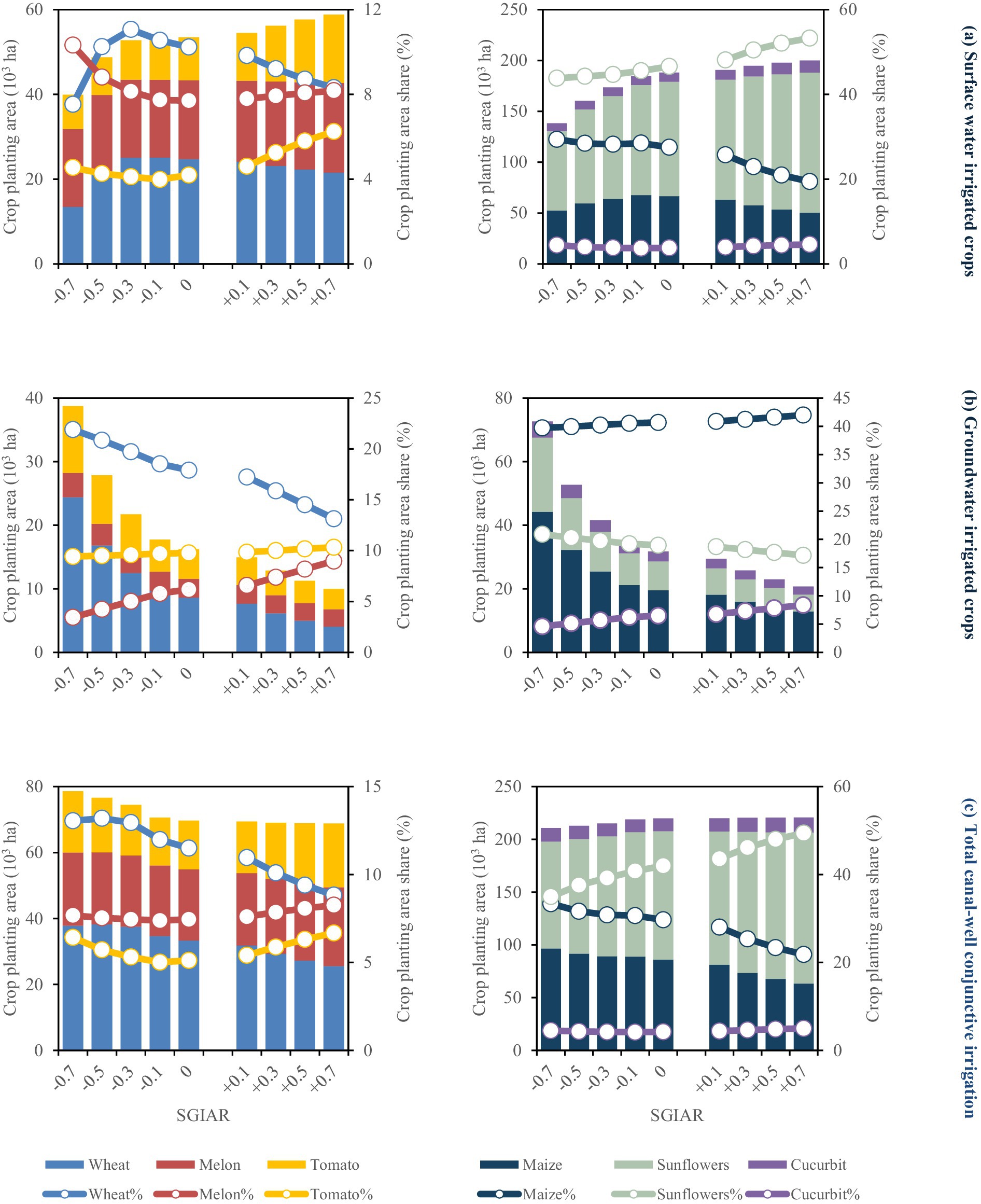 When the SGIAR is increased from baseline 0% to 70%, surface water shortages occur during April to June and July to September. For surface-water irrigated crops, farmers strategically reallocate planting shares from low-value grain crops (wheat and maize) to high-value cash crops (melons, tomatoes, and sunflowers) to maximize agricultural net benefits. For groundwater-irrigated crops, summer crop shares shift from wheat to melons/tomatoes, and fall crop shares shift from sunflowers to maize. Across the entire CWCID, the planting areas of wheat and maize decrease significantly, while those of tomatoes, melons and sunflowers increase. This trend aligns with the cropping patterns of surface-water irrigated crops, reflecting farmers’ adaptive decision-makings in response to surface water scarcity.