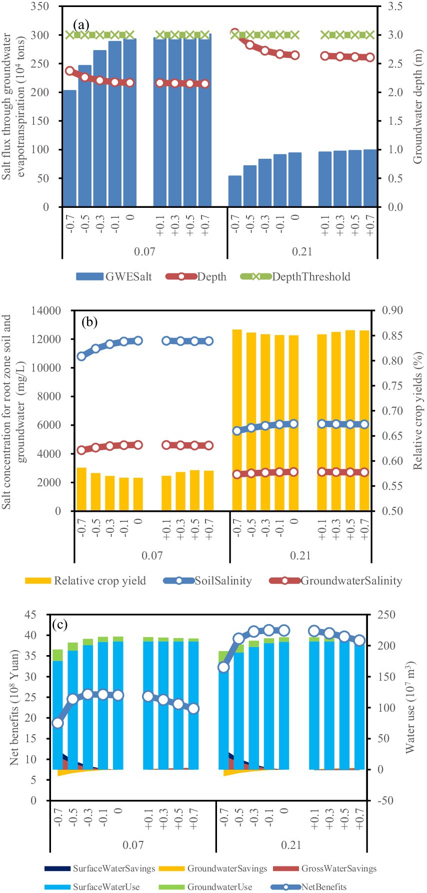 Figure 4. Effects of irrigation-drainage strategies on (a) groundwater depth and salt flux through groundwater evapotranspiration; (b) soil salinity, groundwater salinity, and relative crop yield under salinity stress; (c) water use, water savings and agricultural net benefits. 0.07 and 0.21 illustrate the groundwater drainage capacity of α = 0.07 and α = 0.21, respectively. −0.1, −0.3, −0.5, and −0.7 indicate the reduction of the surface-to-groundwater irrigation area ratio (SGIAR) by 10, 30, 50, and 70%, respectively. +0.1, +0.3, +0.5, and +0.7 illustrate the SGIAR increase by 10, 30, 50, and 70%, respectively. All results are at the 15th year of strategy implementation.