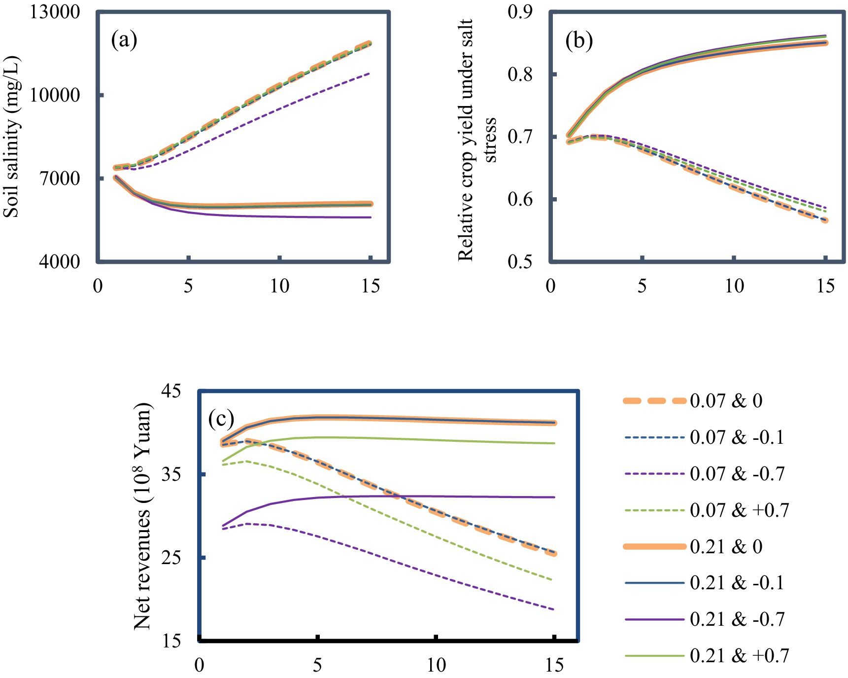 Figure 5. Long-term evolutionary impacts of canal-well conjunctive irrigation-drainage management policies on (a) soil salinity; (b) relative crop yield under salinity stress (with sunflower in the WLT as representative crop); (c) net benefits. “0.21 & –0.1” illustrates the reduction of the surface-to-groundwater irrigation area ratio (SGIAR) by 10% under groundwater drainage capacity of α = 0.21, and other symbols can be similarly explained. The horizontal axis denotes the model is continuously run over 15-year planning horizon.