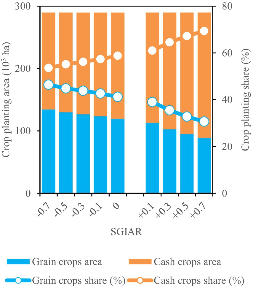 Figure 6. Planting area and share of grain crops and cash crops at the 15th year of strategy implementation. −0.1, −0.3, −0.5, and −0.7 indicate the reduction of the surface-to-groundwater irrigation area ratio (SGIAR) by 10, 30, 50, and 70%, respectively. +0.1, +0.3, +0.5, and +0.7 illustrate the SGIAR increase by 10, 30, 50, and 70%, respectively. All results are under baseline drainage capacity of α = 0.07.