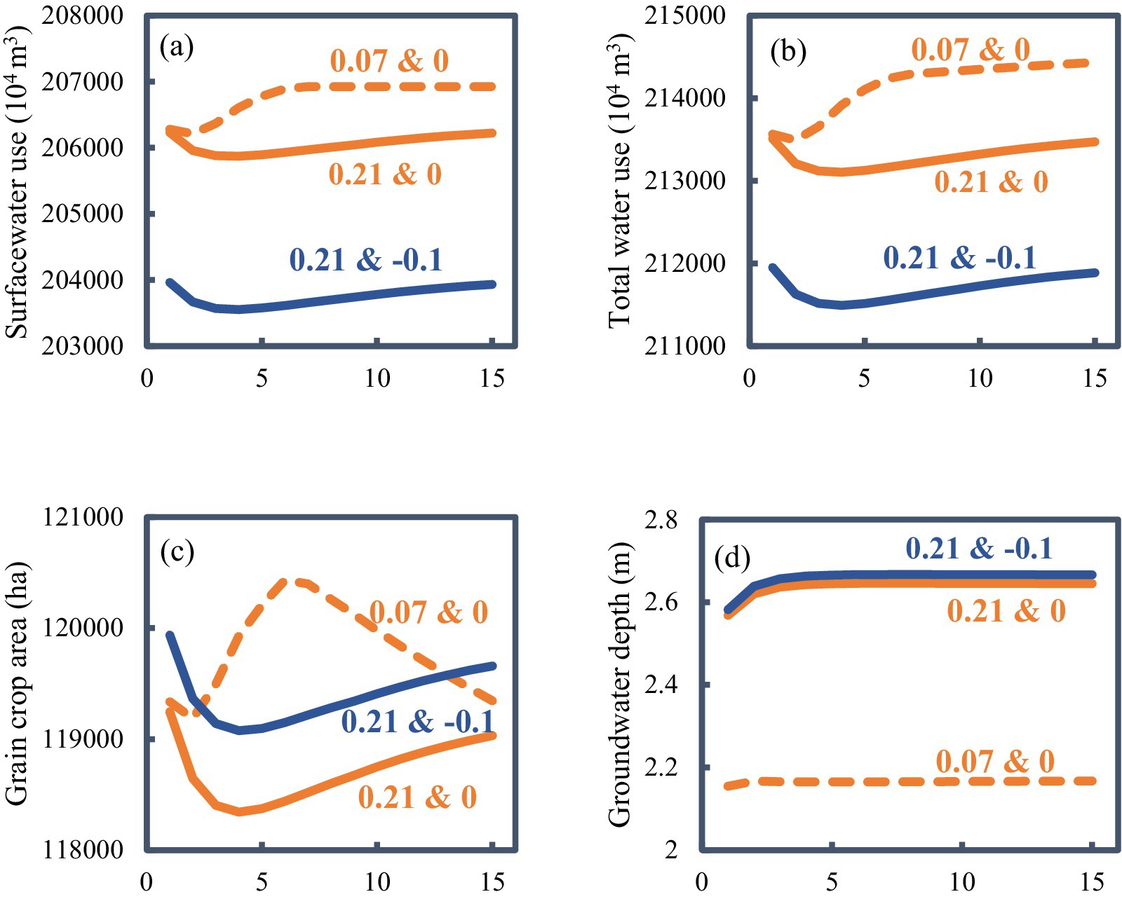 Figure 7. Comparison between economic optimal strategy of “0.21 & −0.1” with the benchmarking policies of “0.07 & 0” and “0.21 & 0” on (a) surface water use; (b) total water use; (c) grain crop planting area and food security, and (d) groundwater depth and groundwater sustainability. “0.21 & −0.1” illustrates the reduction of the surface-to-groundwater irrigation area ratio (SGIAR) by 10% under groundwater drainage capacity of α = 0.21, and other symbols can be similarly explained. The horizontal axis denotes the model is continuously run over 15-year planning horizon.