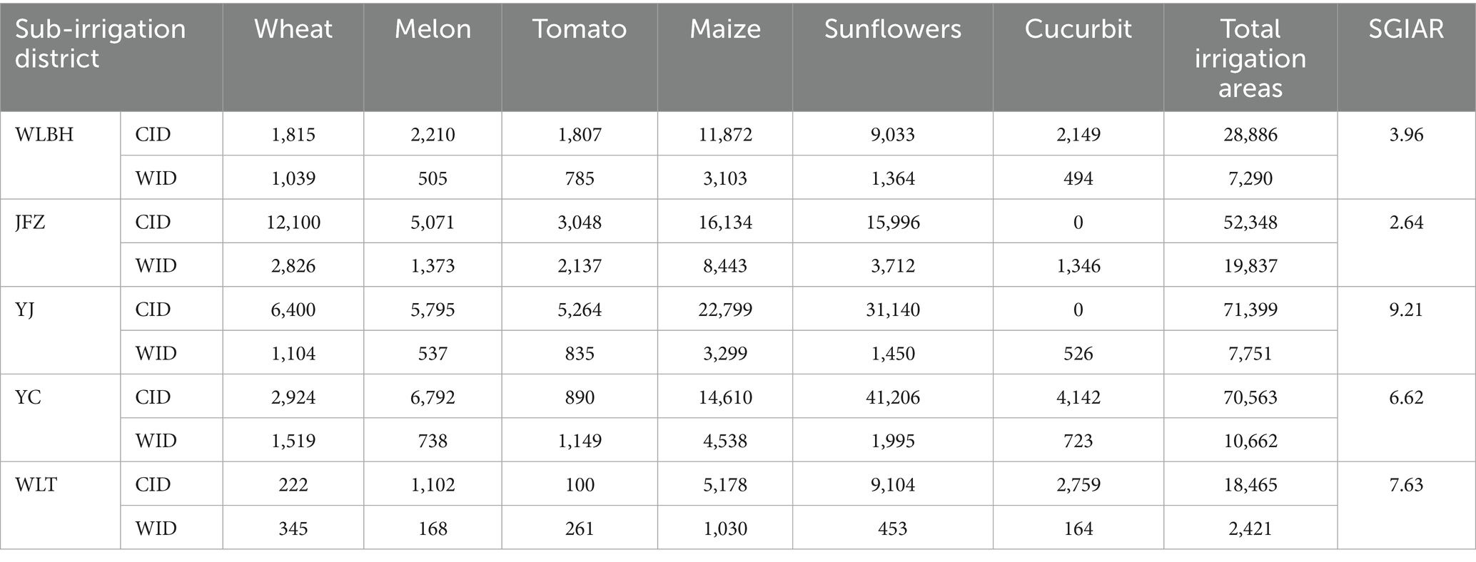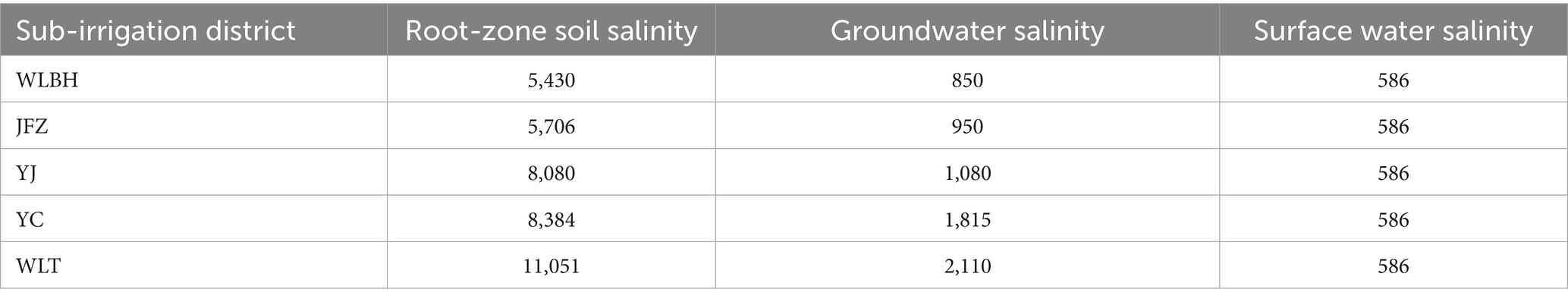 The annual irrigation cycle for each hydrological year consists of two distinct periods: a non-irrigation season (December to March of the following year) without crop production or irrigation activities, and an irrigation season from April to October. Agricultural production follows a dual-cropping system, with summer crops irrigated in April to June (including wheat, melons, and tomatoes), and fall crops irrigated in July to September (including maize, sunflowers and cucurbit). Collectively these crops account for 92.2% of the total cultivated area. Additionally, non-growing period irrigation (including spring irrigation in May and winter irrigation in October to November) is conducted exclusively via surface water irrigation, aiming at soil salinity leaching and moisture conservation (Cao et al., 2023). Detailed data are taken from previous studies (Wang, 2018; Ren et al., 2019; Xu et al., 2019; Dou et al., 2020; Zhu et al., 2020) and reports prepared by local governmental agencies (Bayannur Water Conservancy Bureau, 2019; Hetao Irrigation District Administration, 2019). Specifically, cropping patterns and surface-to-groundwater irrigation area ratio (SGIAR) (Wang, 2018; Bayannur Water Conservancy Bureau, 2019), and groundwater salinity (Hetao Irrigation District Administration, 2019; Zhu et al., 2020), root-zone soil salinity (Ren et al., 2019; Xu et al., 2019; Dou et al., 2020) and surface water salinity (Hetao Irrigation District Administration, 2019) in each sub-irrigation district are listed in Tables 1, 2, for the base year.
