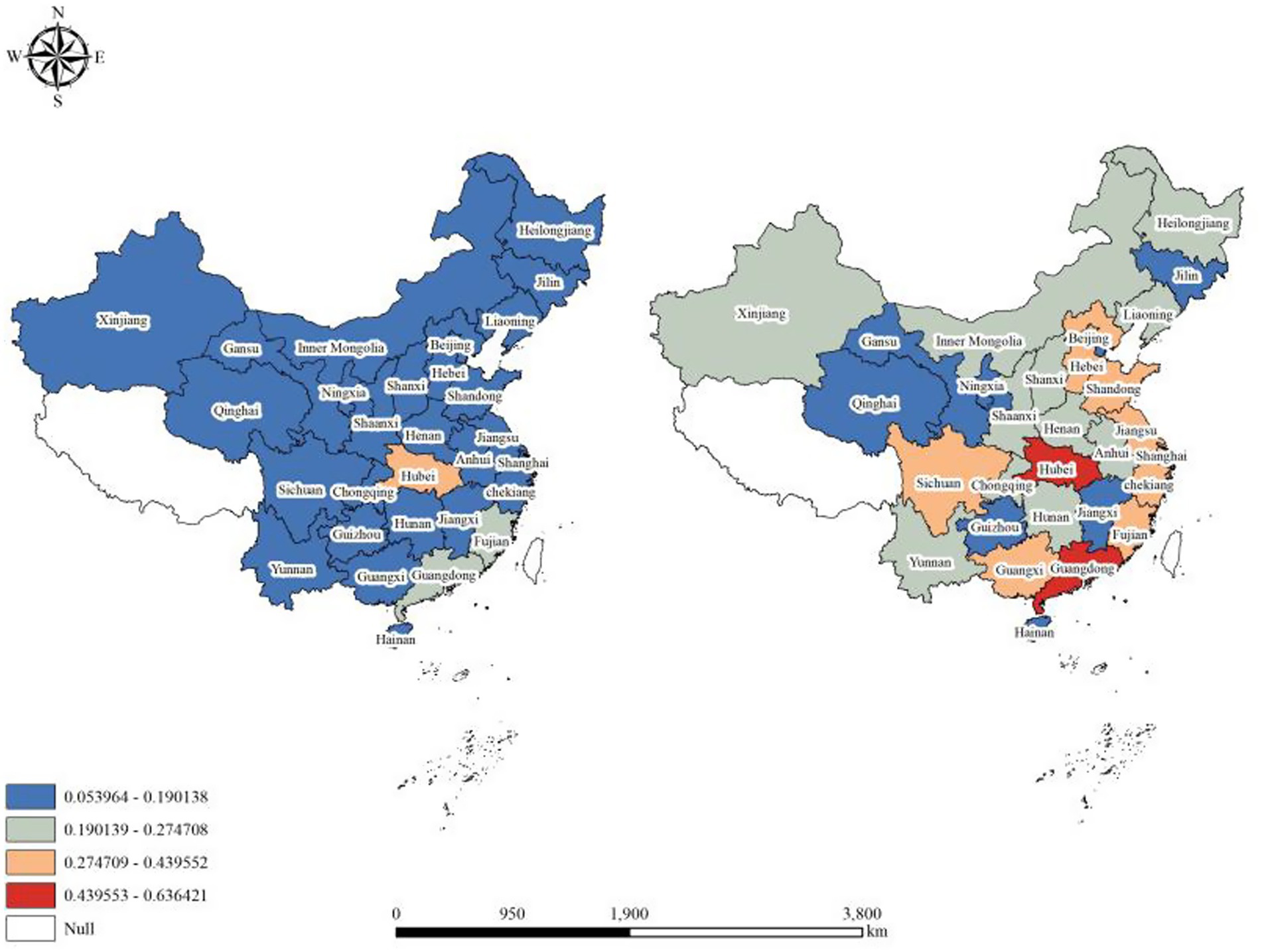 In Equation 4, the Global Moran’s Index I, the Local Moran’s Index Ii is not restricted to [−1, 1], but its interpretation is similar. When Ii > 0, it indicates that the variable values in region i are similar in size to those in the surrounding region; When Ii < 0, it indicates that there is a significant difference in the variable values between region i and the surrounding region; When Ii = 0, it indicates that there is no spatial clustering phenomenon near region i.
