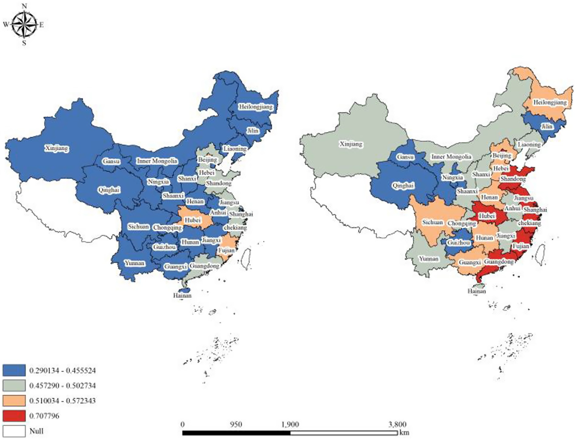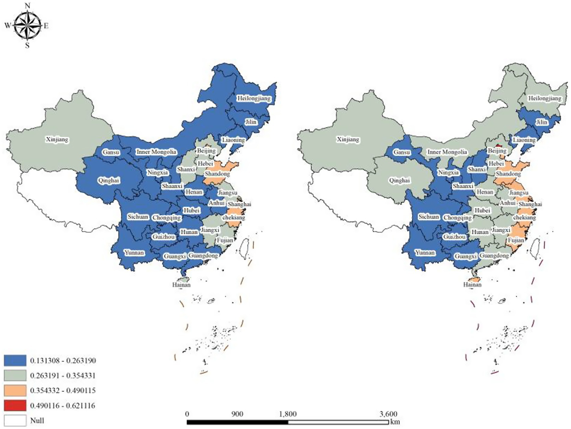 The distribution pattern of the platform economy in reducing the urban–rural income gap in China’s 30 provinces is as follows: