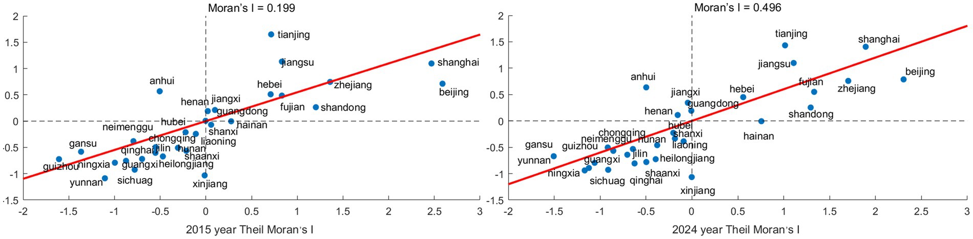 The global Moran’s index reflects the overall trend of spatial correlation, but cannot describe the differences between local regions. In order to test the spatial differences between each region and its surrounding regions, this paper draws local Moran scatter plots of the Theil index and platform economy development level for 2015 and 2024, based on the standardized inverse distance squared matrix (W2), as shown in Figures 5, 6.