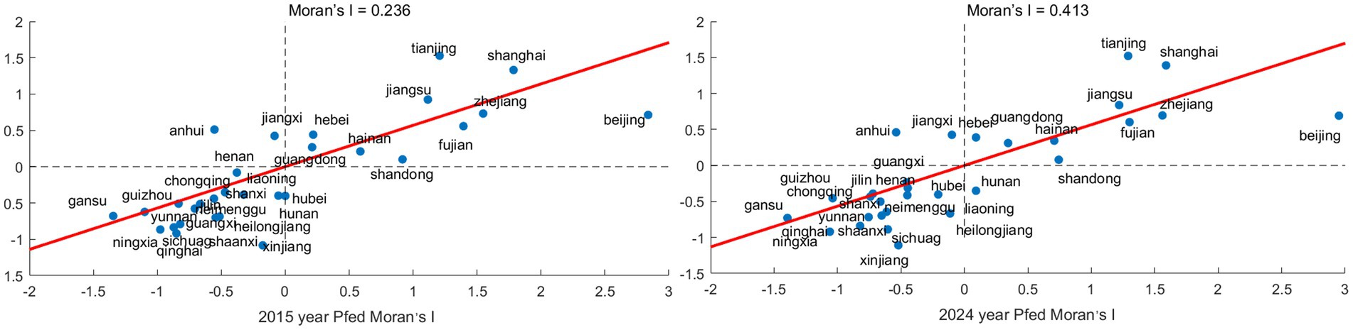 The distribution of platform economy in China’s 30 provinces shows distinct patterns, mainly characterized by regional imbalance. First, the development level of platform economy is higher in the eastern region than in the western region. Provinces such as Beijing, Shanghai, Jiangsu, Zhejiang, and Guangdong have a higher level of platform economy development. These regions have a strong economic foundation, abundant innovative resources, and a sound internet infrastructure. They are home to a large number of high-tech enterprises and innovative talents, which provide favorable conditions for the development of platform economy. The development level of platform economy in the central and western regions is relatively lower. However, it has been developing in recent years and the gap with the eastern region is gradually narrowing. Second, there is spatial agglomeration and positive correlation. Provinces with a high level of platform economy development tend to cluster with neighboring provinces of the same level, forming “high-high” agglomeration areas. For example, the eastern coastal regions, including Beijing, Shanghai, Jiangsu, Zhejiang, and Fujian, are such areas. Low development level provinces also show a certain degree of agglomeration, but this trend has weakened over time. The development level of platform economy in China shows spatial positive correlation, that is, the development level of platform economy in one region is related to that of its neighboring regions. Third, there is dynamic evolution. The development speed of platform economy in the eastern region is faster and the level is higher. Its average value increased from 0.313 in 2015 to 0.767 in 2024. Although the development level of platform economy in the central and western regions is lower than that in the eastern region, it is also rising. Some areas have explored new resource advantages and unleashed the potential of platform economy development. Fourth, there is a correlation with the level of economic development. The development of platform economy is highly correlated with regional economic development. The distribution pattern is basically consistent with the pattern of China’s economic development level, which is higher in the east and lower in the west. Regions with a higher level of economic development also have a higher level of platform economy development and vice versa (He and Tiejun, 2025).