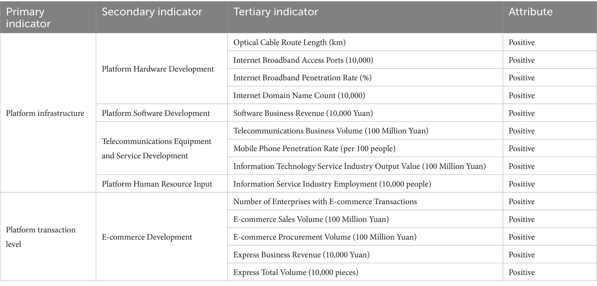 Academia has no unified definition or measurement standard for the platform economy, and there are no official statistics. Scholars use various indicators, such as e-commerce transaction volumes and the “Internet +” index, to measure platform economy development. Some use a single indicator, while others employ multiple dimensions. For example, Huang et al. (2019) built an evaluation system from three aspects: platform infrastructure, input level, and output level. Yan and Liao (2023) Changchun et al. measured it from infrastructure and value interaction levels. He and Liu (2024) assessed it from infrastructure, transaction level, and development space dimensions. Additionally, some scholars use provincial e-commerce transaction volumes Zhang et al., 2019 and “Internet +” indices (Chen and Wu, 2021) as metrics. Therefore, drawing on existing literature, this study measures platform economy development from infrastructure and transaction levels (Table 1), using the entropy method to calculate weights of tertiary indicators, as follows: