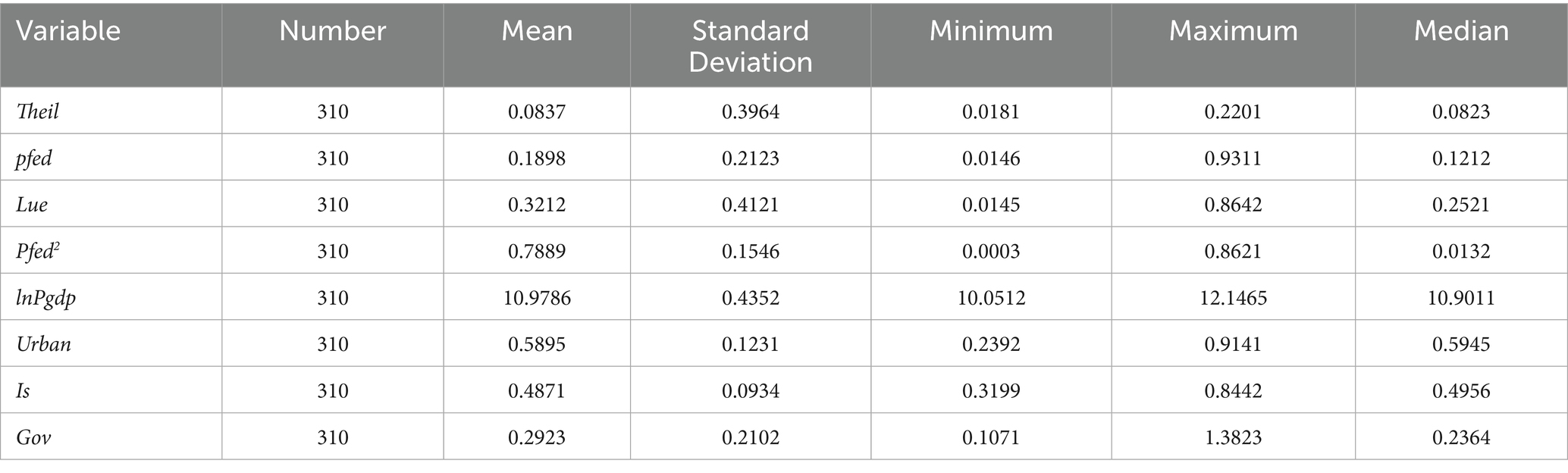 (1) Economic Development Level (lnPgdp). Chen and Wu (2021) found an inverted “U”-shaped relationship between economic development and the urban–rural income gap. Following Jin and Deng (2022) per capita GDP is used as a measure. To mitigate heteroscedasticity, it is log-transformed in the model. (2) Urbanization (Urban). The urban–rural dual structure is a key factor in unbalanced development. As urbanization progresses, free factor mobility can develop rural areas and raise incomes, narrowing the income gap. However, talent flow to cities can have the opposite effect. Following Xu and Chen (2022) urbanization is measured by the share of secondary and tertiary industry employment. (3) Industrial Structure (Is). Industrial structure transformation can narrow the urban–rural income gap by increasing farmers’ income and attracting rural-to-urban employment. Following Zhao (2020) it is measured by the tertiary industry’s share of GDP. (4) Government Intervention (Gov). To reduce the urban–rural income gap, governments use redistribution via transfers and policies. Local government fiscal expenditure, especially on social security, can narrow the gap. Following Dong et al., it is measured by local fiscal expenditure’s GDP share (Dong and Man, 2017).