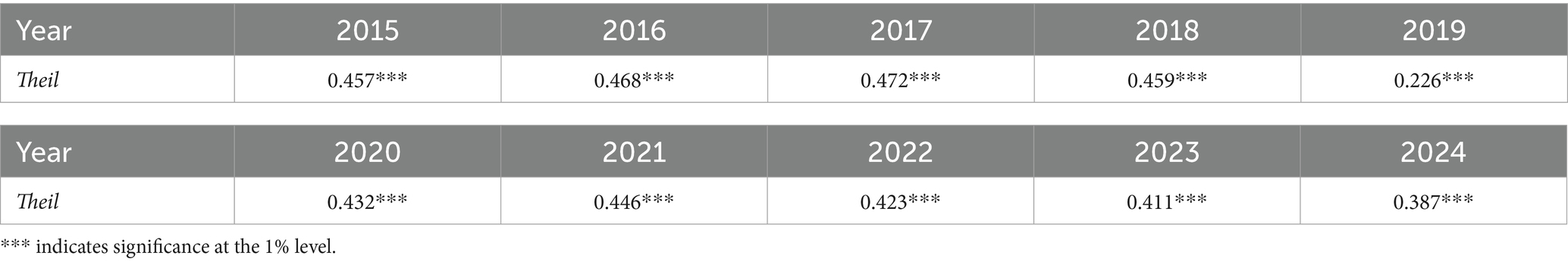 To measure urban–rural income gaps, scholars often use the ratio of urban to rural per capita disposable income, the Gini coefficient, or the Theil index. The income ratio is simple but ignores internal income and population distribution within urban and rural areas. The Gini coefficient, based on the Lorenz curve, is unevenly sensitive to income changes across different groups (Jin and Deng, 2022). In contrast, the Theil index, using information entropy theory, considers internal population and income distribution and is more sensitive to income changes in both high-and low-income groups, providing a more accurate and comprehensive reflection of income disparities. Thus, this study uses the Theil index, a positive indicator where a higher value signifies a larger urban–rural income gap. This model is shown in Equation 8: